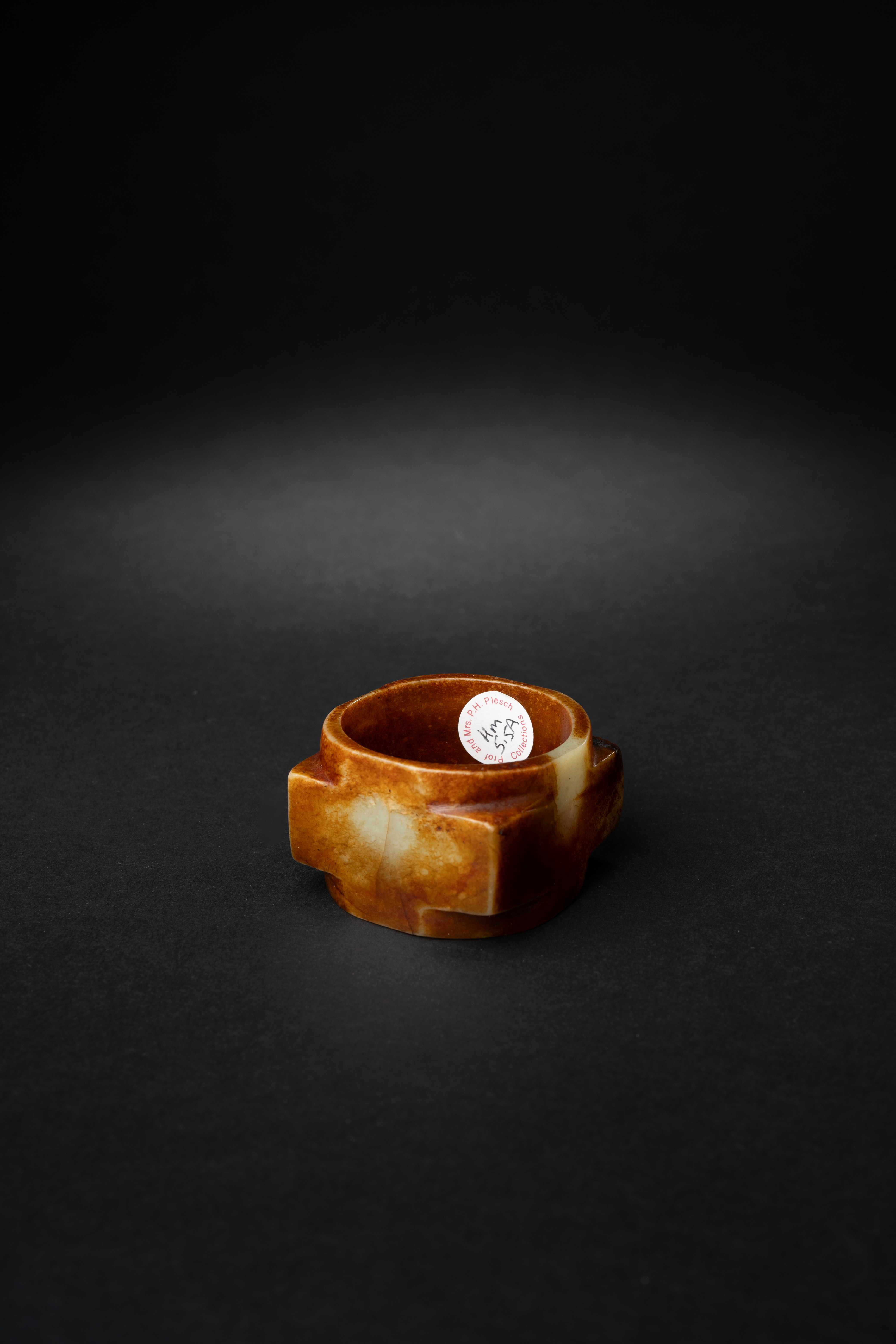 With square corners, the sides of the hollow cylinder flattened, the stone with russet and green markings, with a paper label for the Prof and Mrs P H Plesch Collections, no.Hm5.5A, 5.6cm.