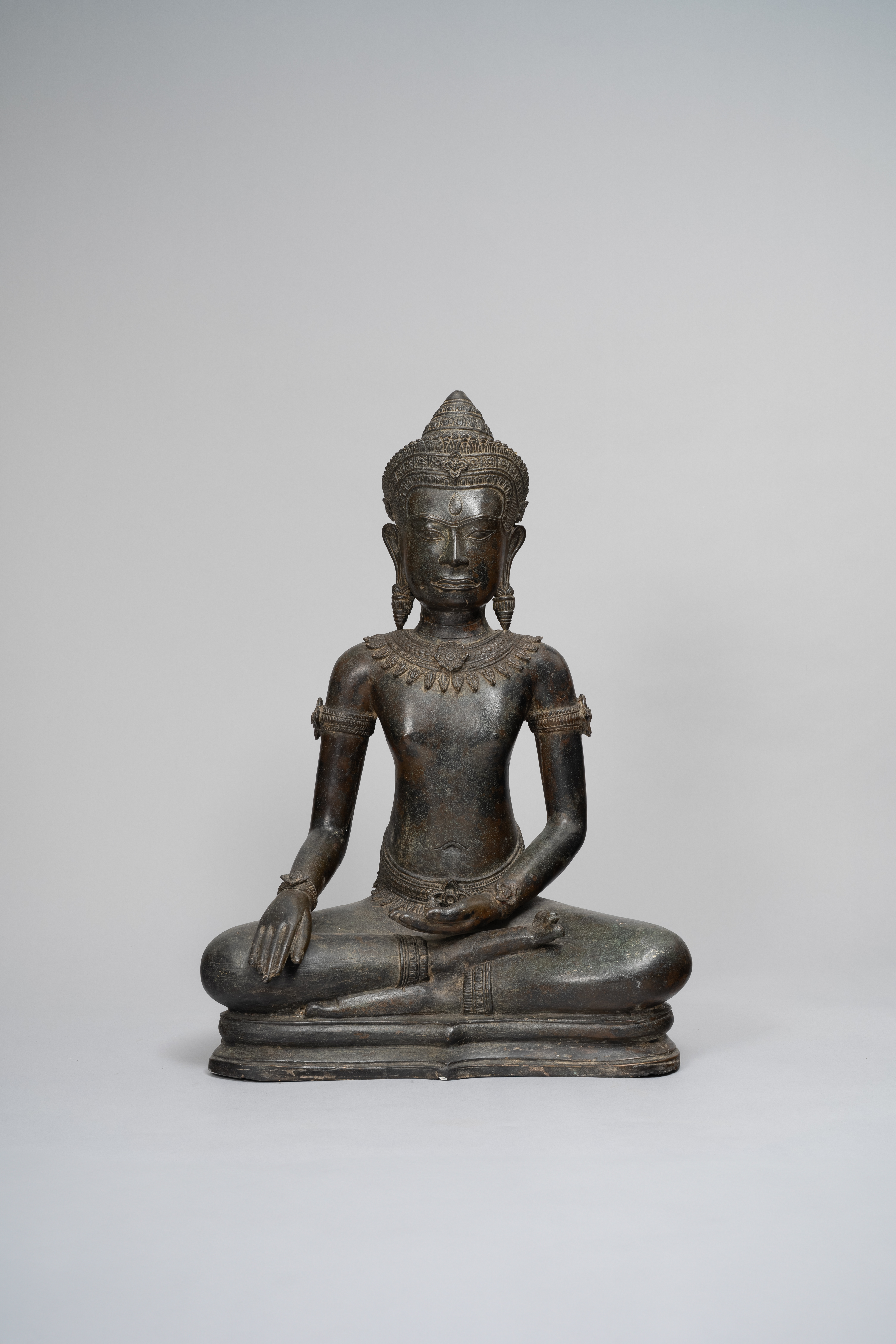 Seated in dhyanasana on a plinth, with his right hand in bhumisparsa mudra, adorned with elaborate jewellery, his hair in tight curls rising to a ushnisha, 12kg, 55.5cm.