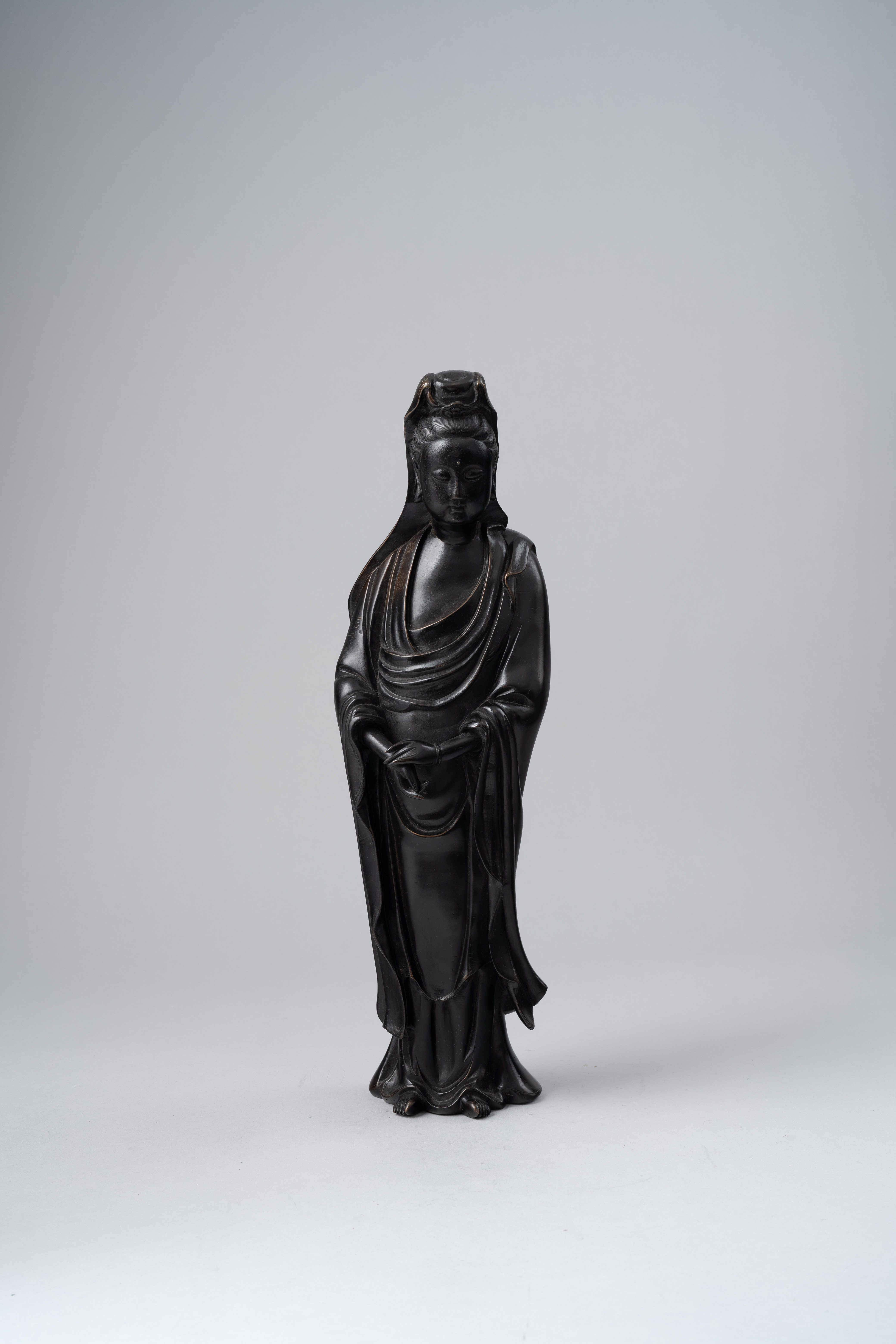 Silver-inlaid bronzes attributed to Shi Sou are known for their exceptional quality, yet there is no recorded information confirming the identity of this maker. Believed to have been a monk active in the late Ming period (c.1620-44), it is also possible that the mark for Shi Sou could relate to a bronze studio or school. A consistent feature of figures associated with this maker is their elegant modelling, as seen in the piece offered here. Three similar silver-inlaid bronze figures of Guanyin, all inlaid with Shi Sou marks and dated to the Ming dynasty, are in the Palace Museum, Beijing, illustrated in Classics of the Forbidden City: Guanyin in the Collection of the Palace Museum, pls.43-45. Another variant of a silver-inlaid bronze Guanyin, bearing a Shi Sou mark and dating from the mid-16th to mid-17th century, is illustrated in Sydney L Moss Ltd's exhibition catalogue, Emperor Scholar Artisan Monk: The creative personality in Chinese works of art, pp.280-281, no.132.