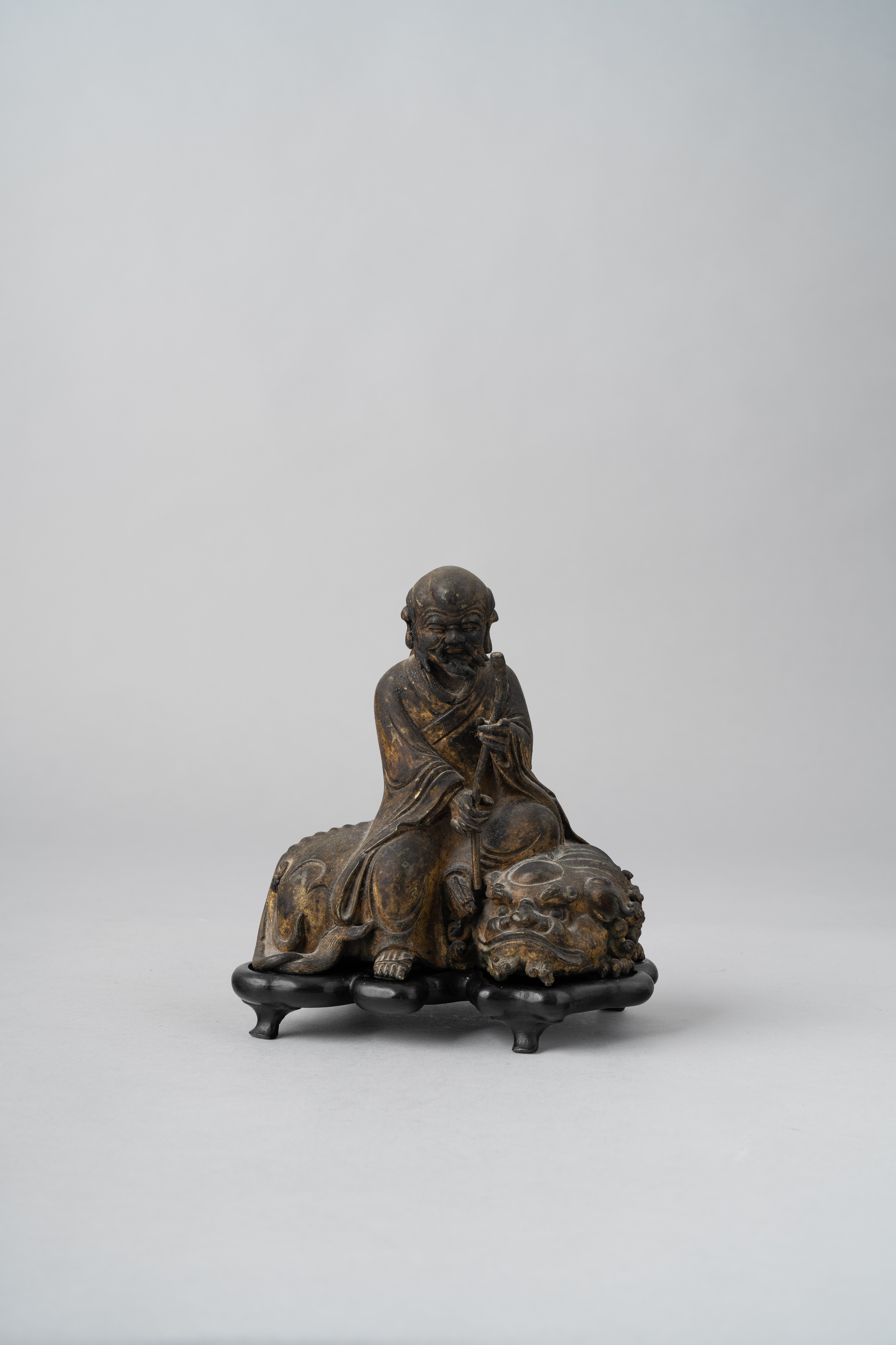 A CHINESE GILT-BRONZE 'LUOHAN AND BUDDHIST LION' GROUP