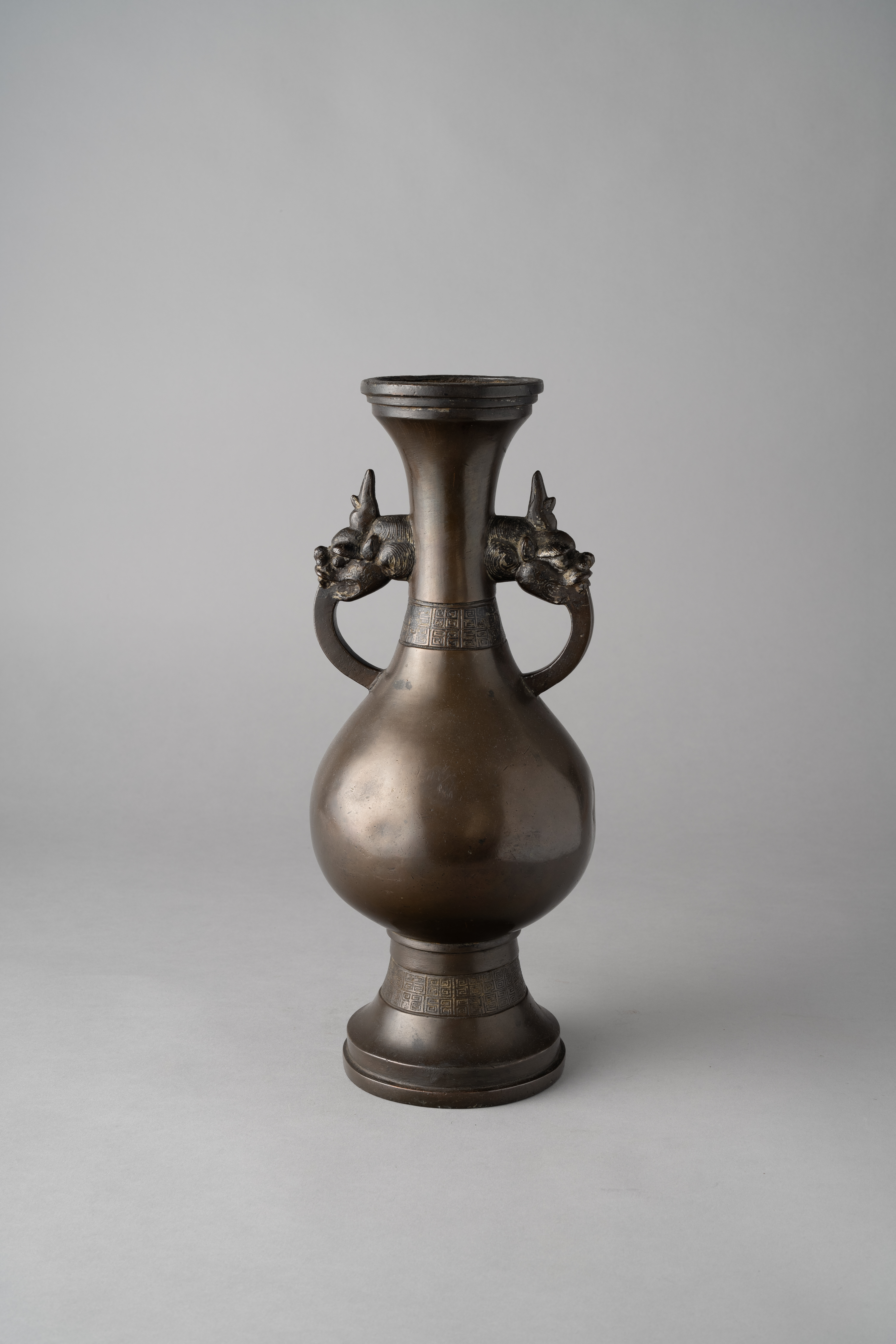 The imposing shape of the present lot with its high foot and elaborate handles detailed with prominent animal masks would have made it an appropriate piece for display on a temple altar. This vase would probably have featured as part of a five-piece set comprising two candle holders, a pair of flower vases and an incense burner. Bronze was a particularly prized material and pieces of high quality, as seen here, were generally used on altars in prominent temples and the family shrines of the elite. A slightly smaller example with drop rings to the handles also dated to the Hongzhi period can be seen in the collection of the Saint Louis Art Museum, accession no.16:2005, illustrated in PK Hu, Later Chinese Bronzes: the Saint Louis Art Museum and Robert E Kresko Collections, pp.32-35, no.4.