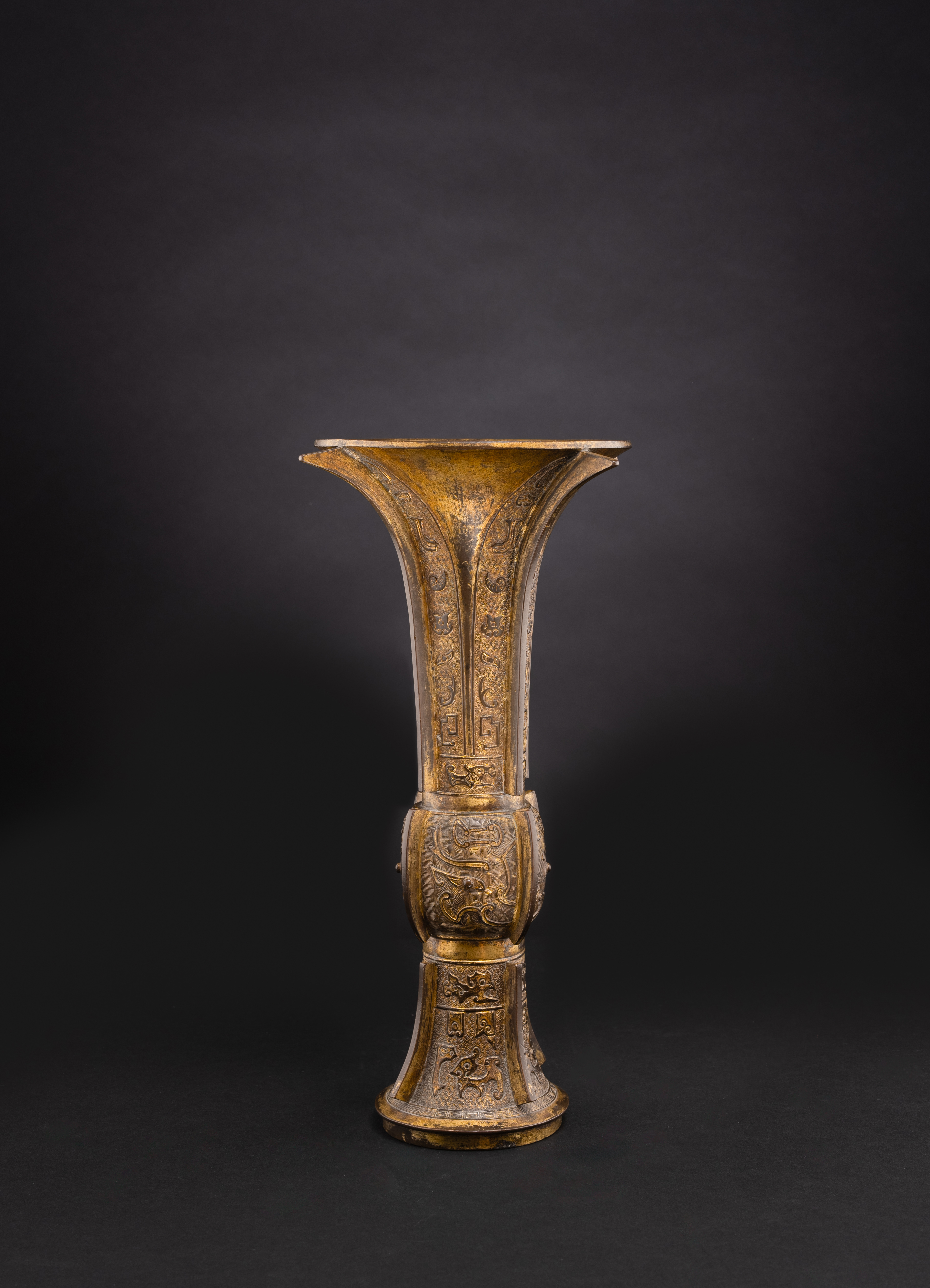 A CHINESE PARCEL-GILT BRONZE ARCHAISTIC BEAKER VASE, GU