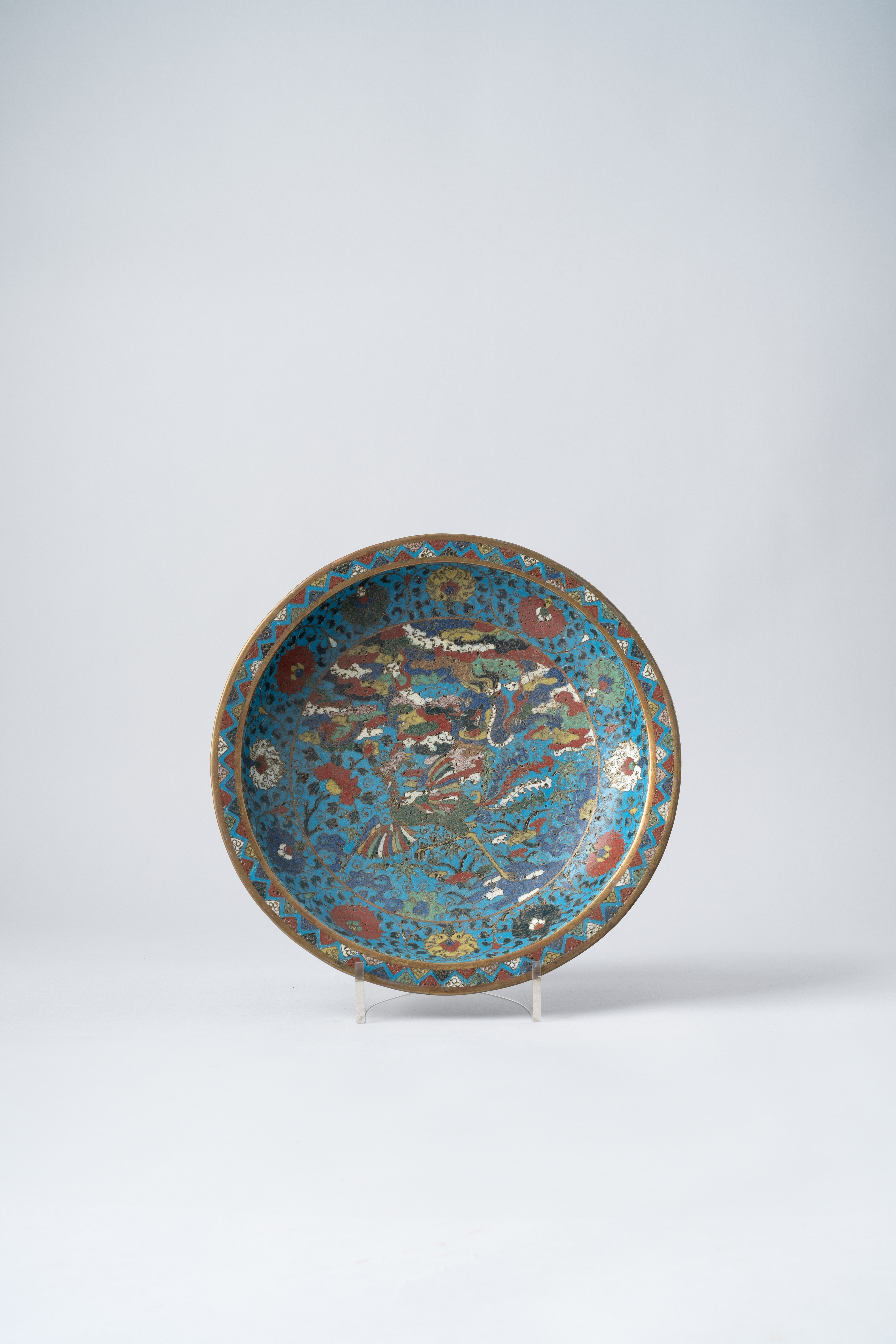 A CHINESE CLOISONNE ENAMEL 'PHOENIX AND DRAGON' DISH