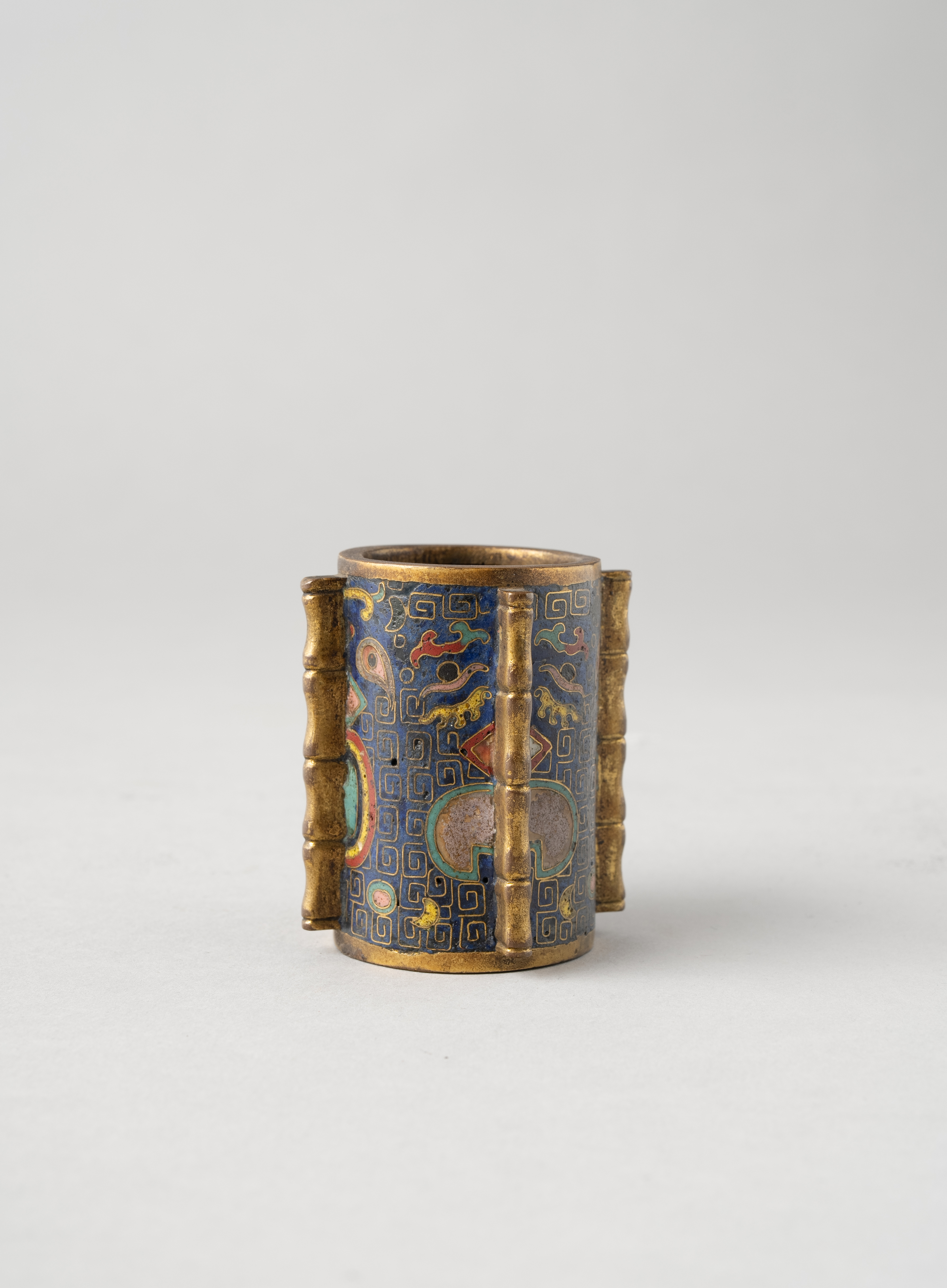 A CHINESE CLOISONNE ENAMEL CYLINDRICAL VESSEL OR SCROLL-END CAP