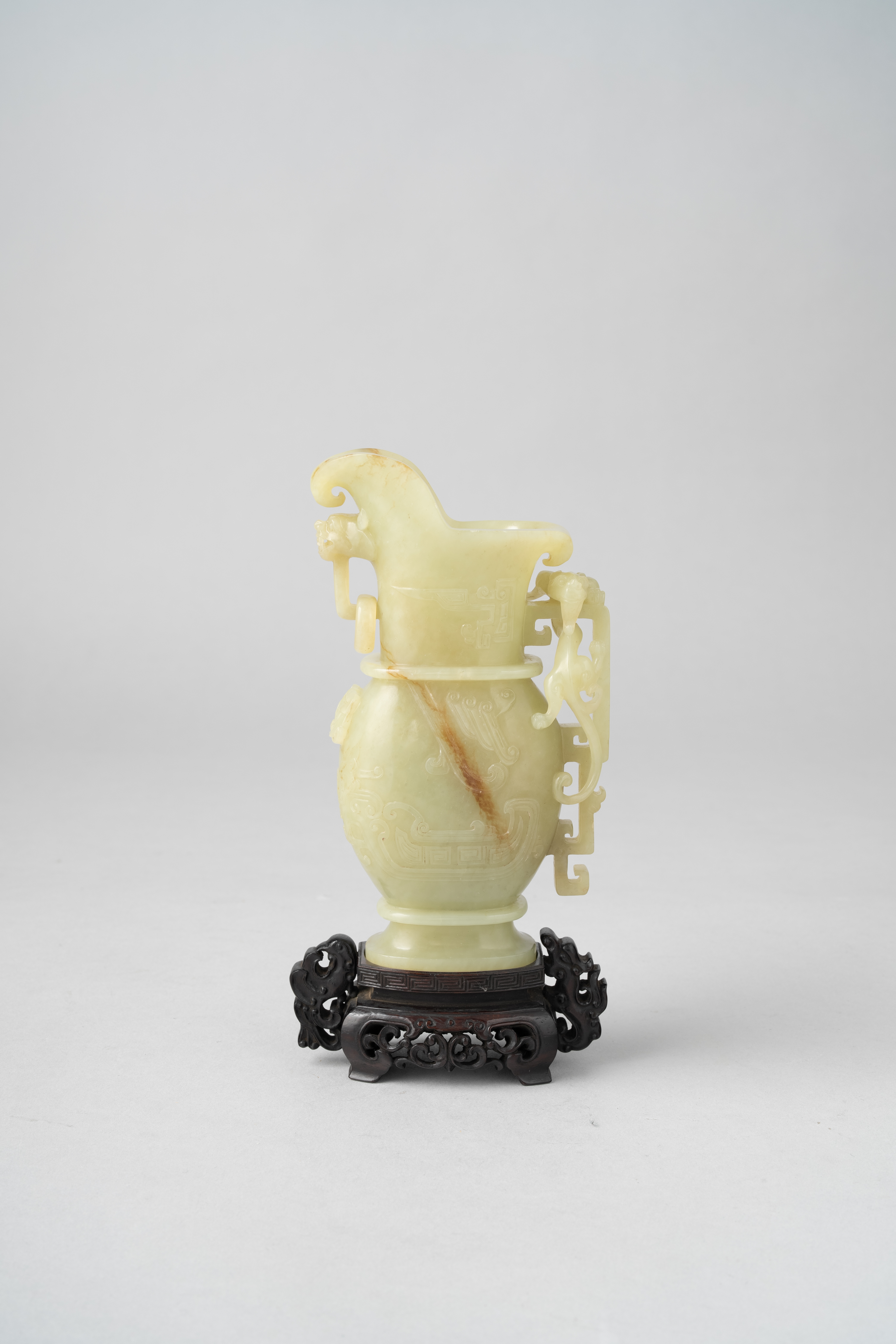The pouring vessel of oval-section, carved in relief with archaistic scrolls and taotie masks, flanked by a handle with a clambering chilong and a smaller handle with a loose ring below the spout, all supported on a gently splayed foot, the stone of an even greenish colour and russet inclusions, together with a reticulated wood stand, 17.5cm. (2)