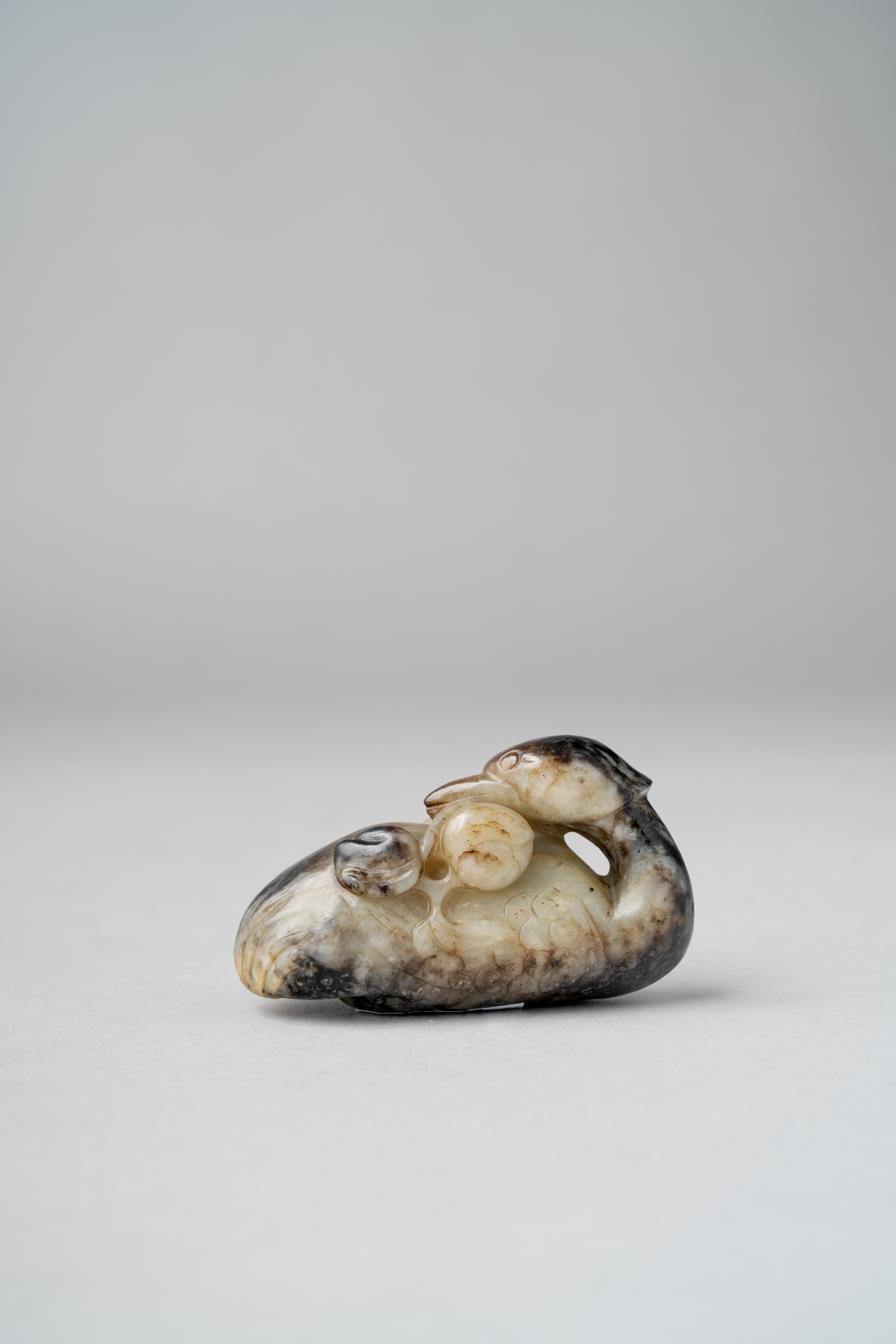 Carved sitting with its feet tucked under its body and its head resting on its back, holding a fruiting peach branch in its beak, the stone of light brown colour mottled with areas of black, 7.2cm.