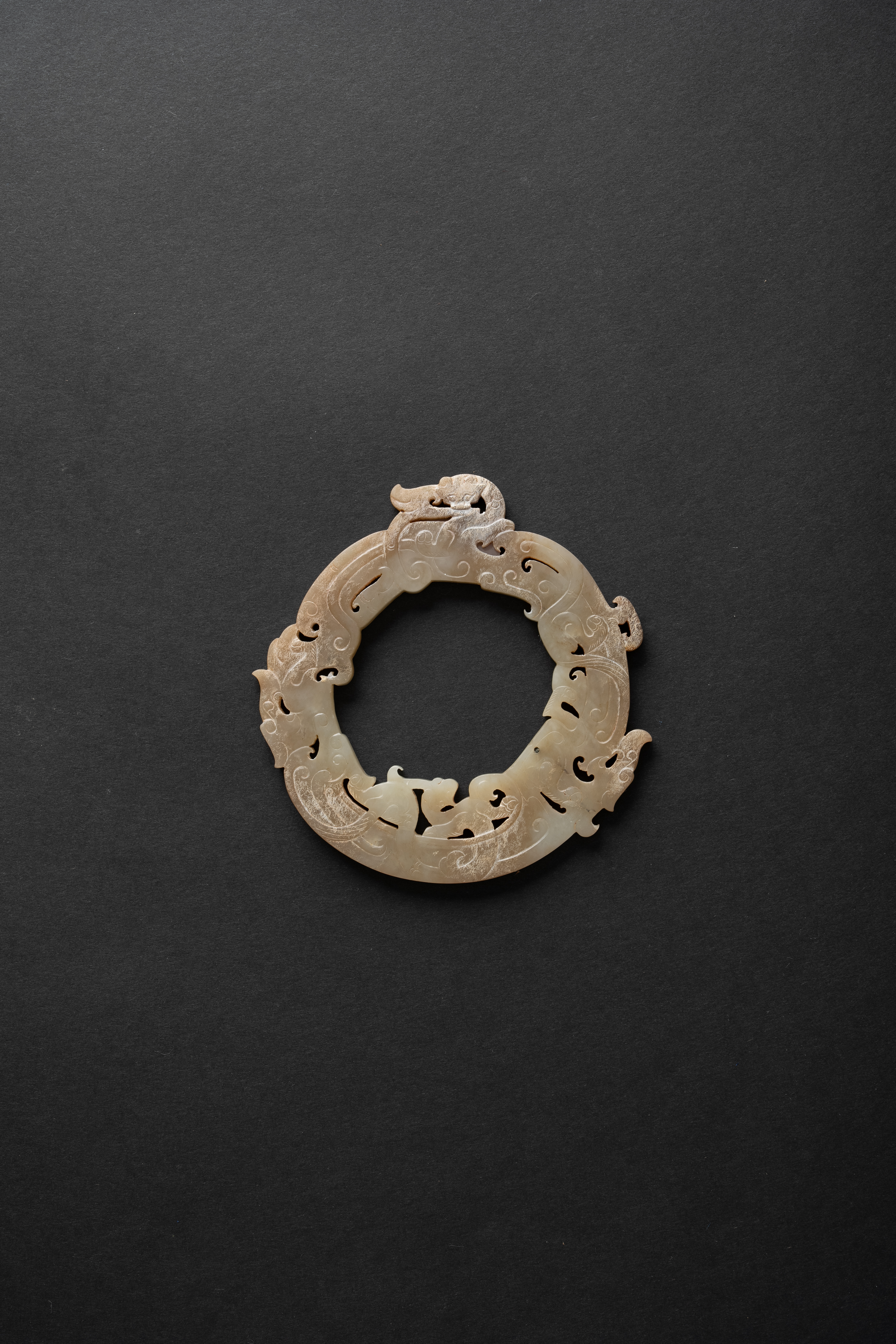 Of circular form carved with two kui-dragons amidst C-scrolls, with two small chilong weaving their way through the scrolling decoration, pierced for suspension to the base of one of the kui-dragons, the semi-translucent stone with russet mottling and veined with calcification, 10.4cm.