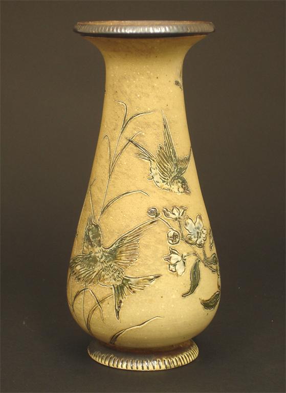 A Martin Brothers stoneware vase incised with finches and wasps flying above wild rose sprays