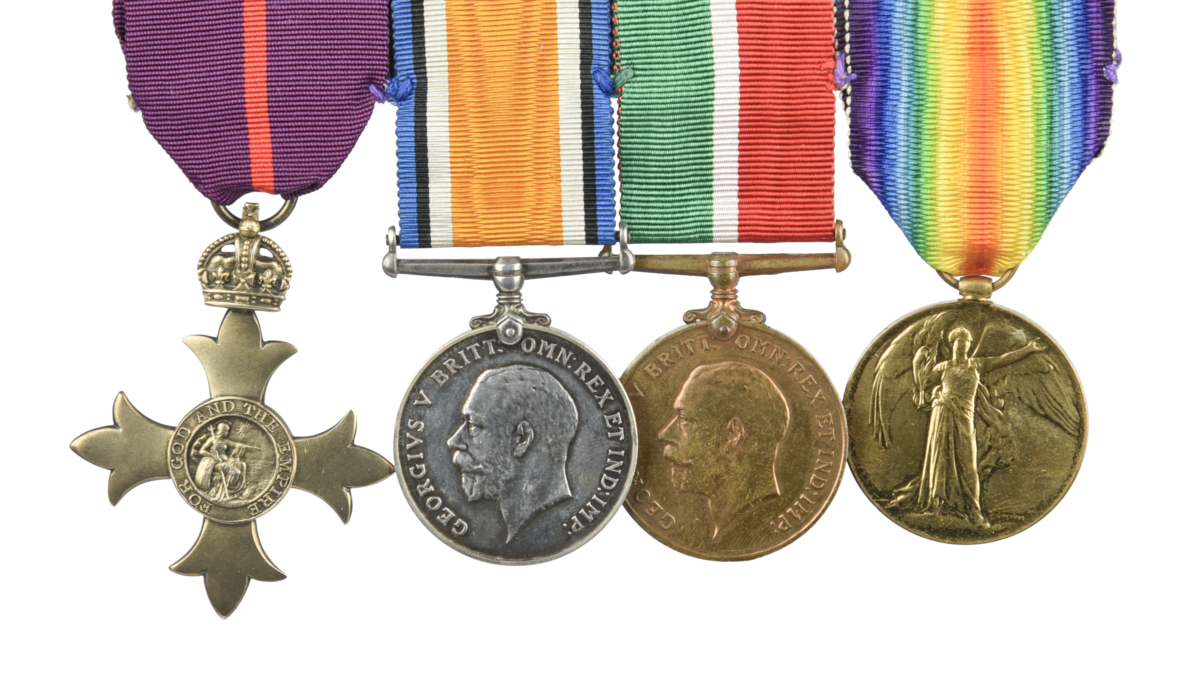 An O.B.E. group of four awards to 2nd Lieutenant Alexander Anderson, Royal Garrison Artillery and Merchant Navy: The Most Excellent Order of the British Empire (Military division), Officer's breast badge; British War Medal 1914-20 (2. LIEUT. A. ANDERSON.); Mercantile Marine War Medal (ALEXANDER ANDERSON); Victory Medal (2. LIEUT. A. ANDERSON.); display mounted, very fine and better. [4]