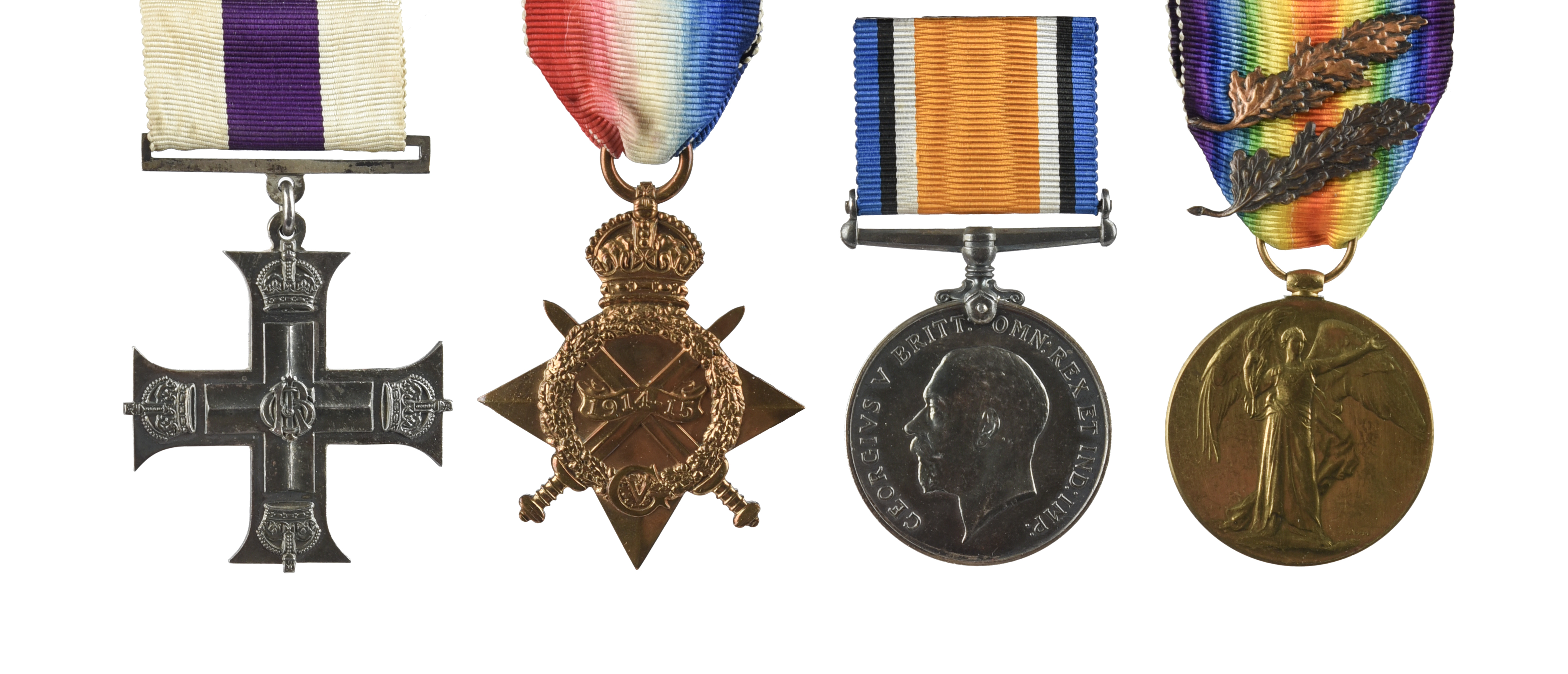 The Great War M.C. group of four to Major Frank Charles Gordon Naumann, Royal Artillery, comprising: Military Cross, George V, unnamed as issued; 1914-15 Star (391 GNR. F.C.G. NAUMANN. H.A.C. (ART.)); British War Medal 1914-20 (MAJOR F.C.G. NAUMANN.); Victory Medal, the ribbon fixed with two oak leaf emblems (MAJOR F.C.G. NAUMANN.), some time mounted for wearing; good very fine or better, [4]; accompanied by the recipient's swing mounted set of corresponding dress miniature medals, about extremely fine; together with a mounted set of seven miniature medals attributable to this officer's son, comprising: M.B.E., 1939-45 Star, Africa Star with 1st Army emblem, Italy Star, Defence Medal, War Medal 1939-45 with oak leaf, George VI Efficiency Decoration with Territorial bar; and other items.