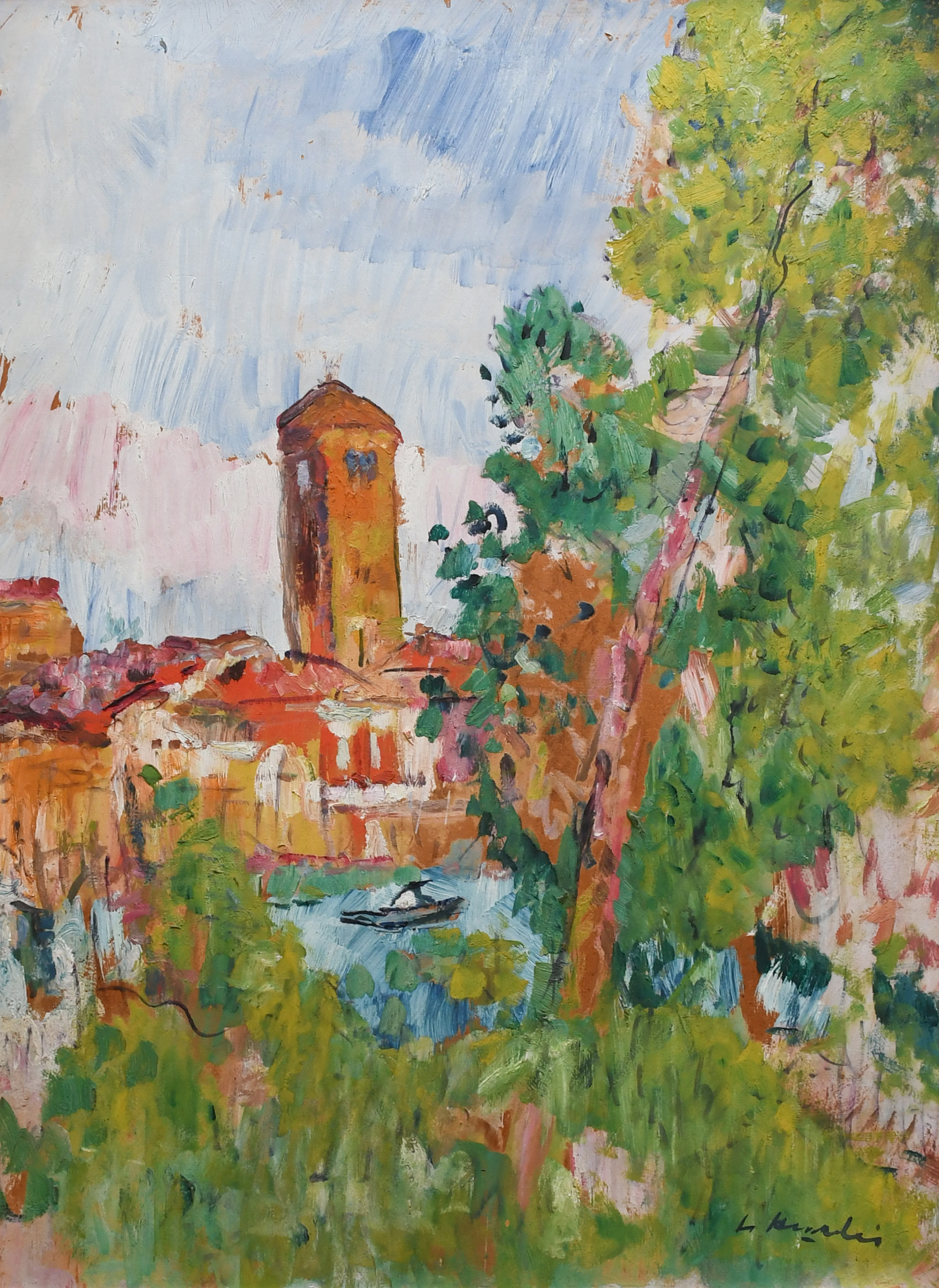 George Leslie Hunter’s first visit to Venice came in 1922, the same year he also painted in Paris and Florence. It was during his visit to Paris that he encountered the latest work of Henri Matisse, which had a profound effect on the development of Hunter’s style. Torcello is one of only twenty-three Venetian oils to survive, and is typical of the period, with its short sharp brushstrokes of vivid colour, and areas of exposed board.