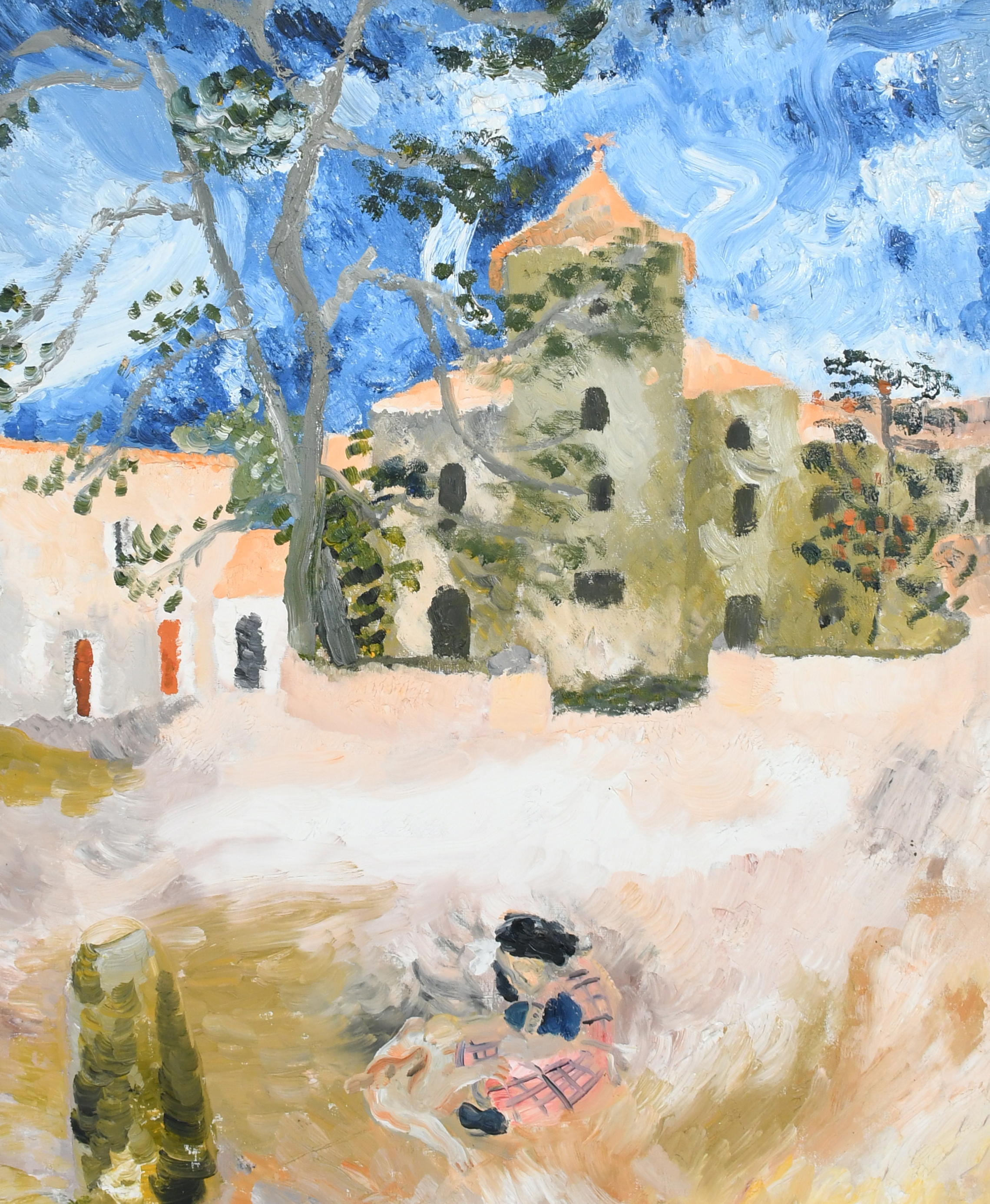 Mas de Fourques, near Lunel in the South of France, was the home ofJeanHugo,greatgrandson of Victor Hugo, and a friend of Winifred Nicholson. Winifred and her children visited Hugo in the 1930s when she painted a number of pictures of Mas de Fourques (see Jovan Nicholson, Winifred Nicholson: Liberation of Colour, Philip Wilson Publishers, London, 2016, pp. 22-23, 74-77, and The Vineyard, Mas de Fourques, Sotheby’s, 17 March 2020, lot 189). The Nicholsons visited again in September 1953 which is probably when the present work was painted. Kate would have been keenly aware of her mother’s paintings of Mas de Fourques, and while there are many similarities, the voice with her characteristic exuberance of colour and delight in the Mediterranean light is clearly her own.