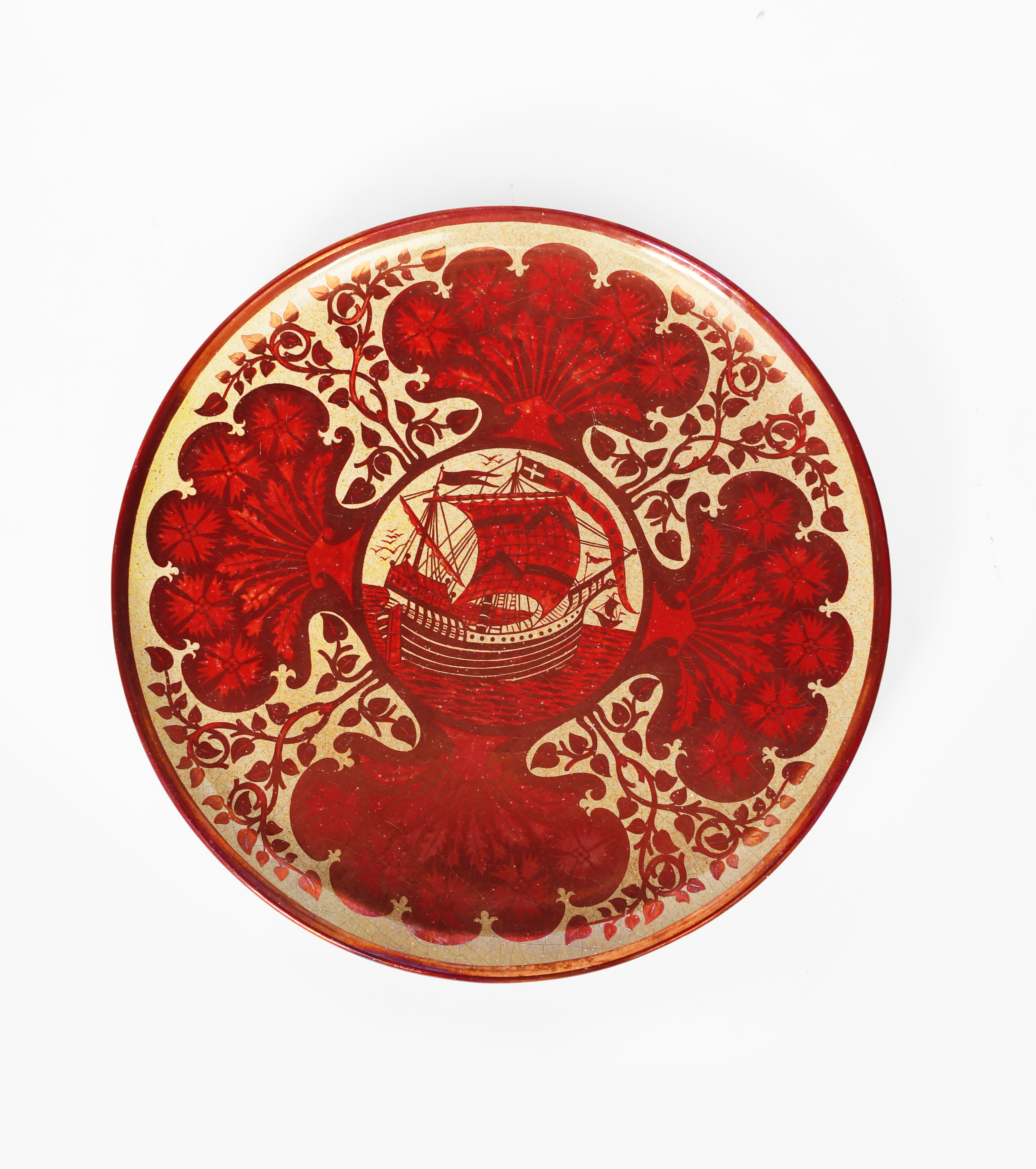 A large Maw & Co wall charger, painted to the well with a Galleon at sail, inside a border of carnation flower panels and scrolling vine, in ruby and copper on a cream ground, printed factory mark, 46cm. diam.
