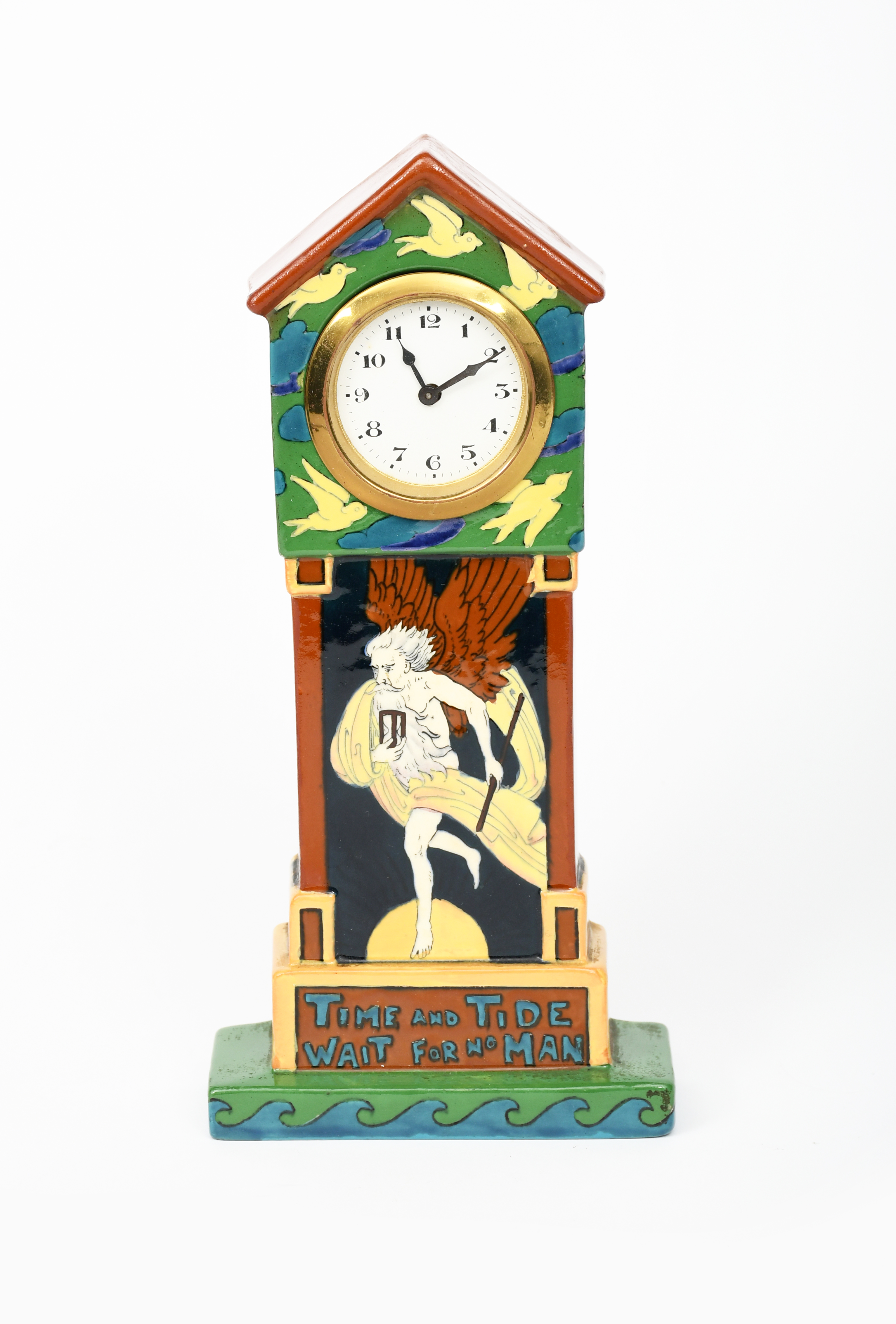 A Foley Intarsio mantel clock designed by Frederick Rhead, model no.3115, printed and painted with an allegorical figure of Time, inscribed Time and Tide Wait For No Man, in colours, printed factory marks, 25cm. high
