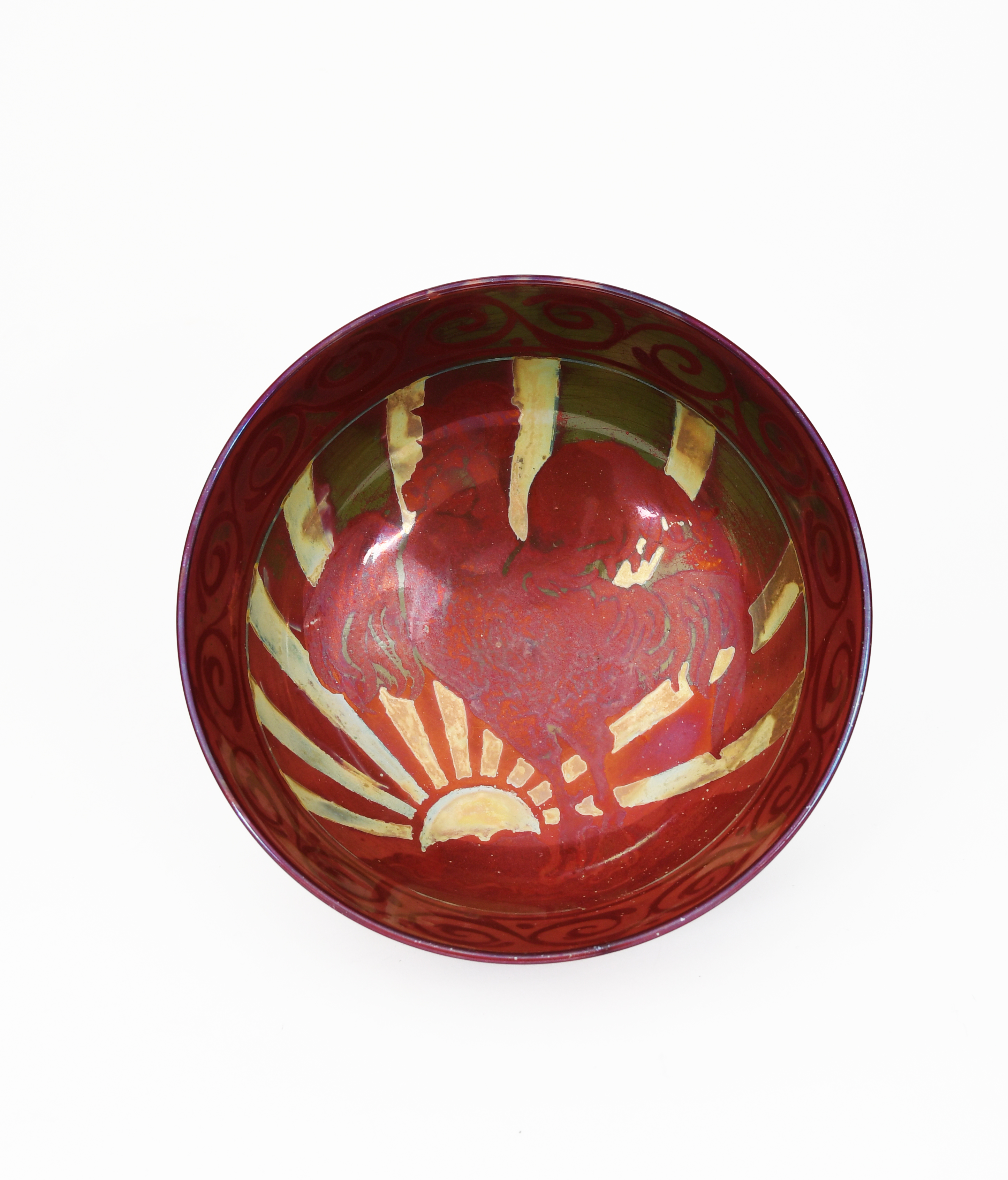 A Bernard Moore flambe bowl, painted to the well with a cockerel before a rising sun, in flambe and golden lustre, inside scroll border, painted Bernard Moore, 19.5cm. diam.