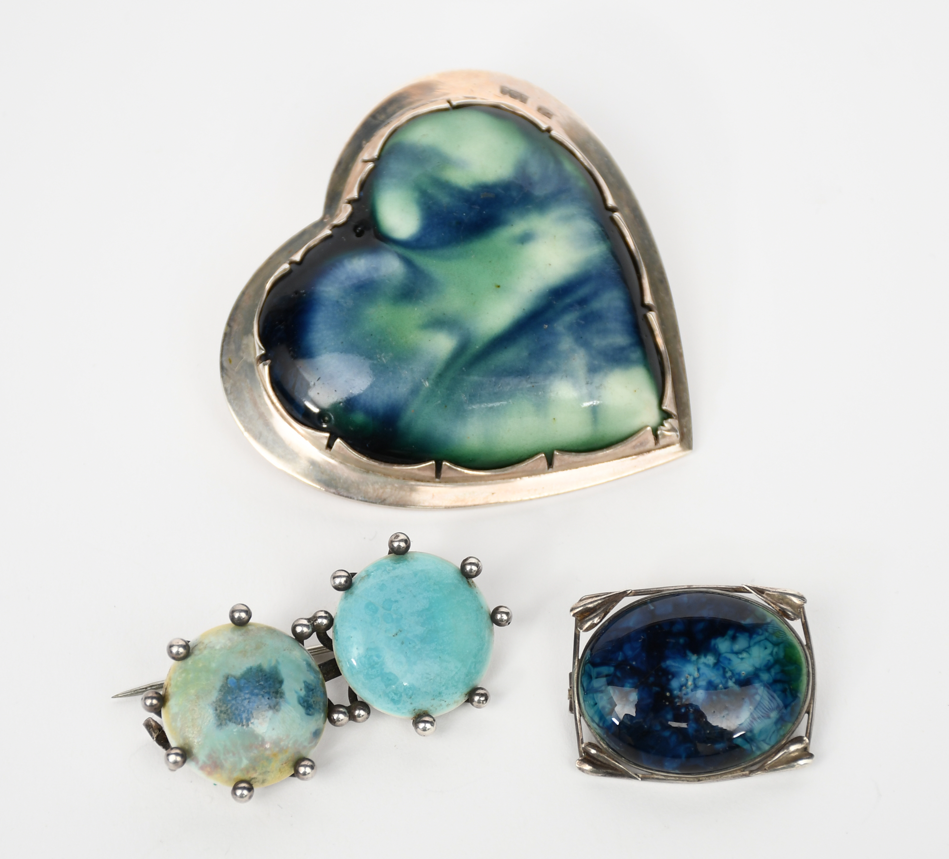 A Ruskin Pottery high-fired stoneware brooch, set in silver frame, the oval ceramic medallion set in pierced rectangular frame with leaf panels, another silver brooch set with two Ruskin Pottery round medallions, and a larger ceramic heart-shaped panel with later silver brooch mount, impressed Ruskin mark to main, heart-shaped brooch stamped hallmarks, Birmingham 1990, 2.5cm wide (main brooch), (3)