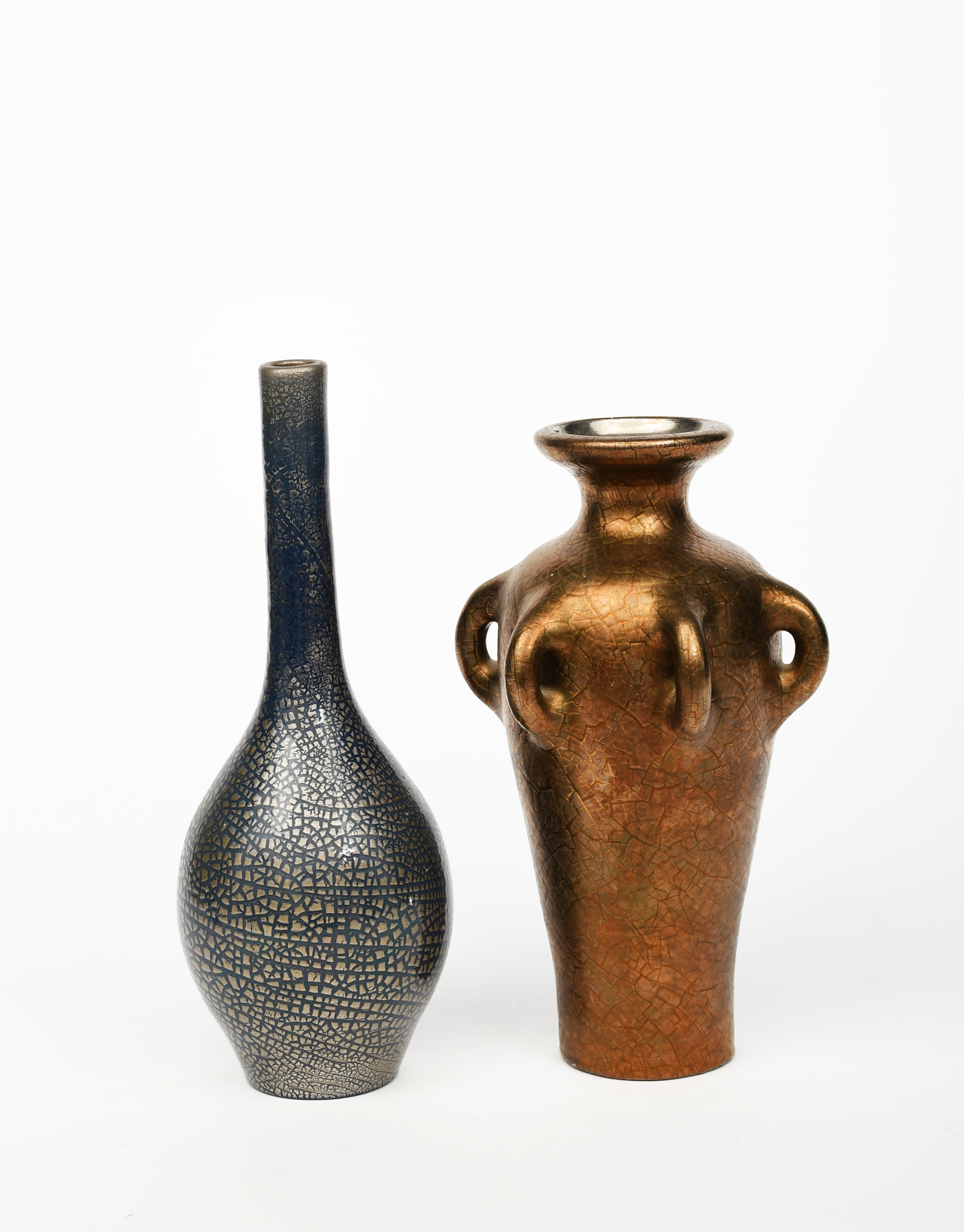 An unusual Sunflower Pottery vase by Sir Edmund Elton, ovoid with tall cylindrical solifleur neck, covered in a golden crackle glaze over blue, and another Sunflower Pottery vase by Sir Edmund Elton, with loop handles to the shoulder, covered in a crackled golden glaze, painted Elton mark, minor glaze loss, 31cm. high (2)