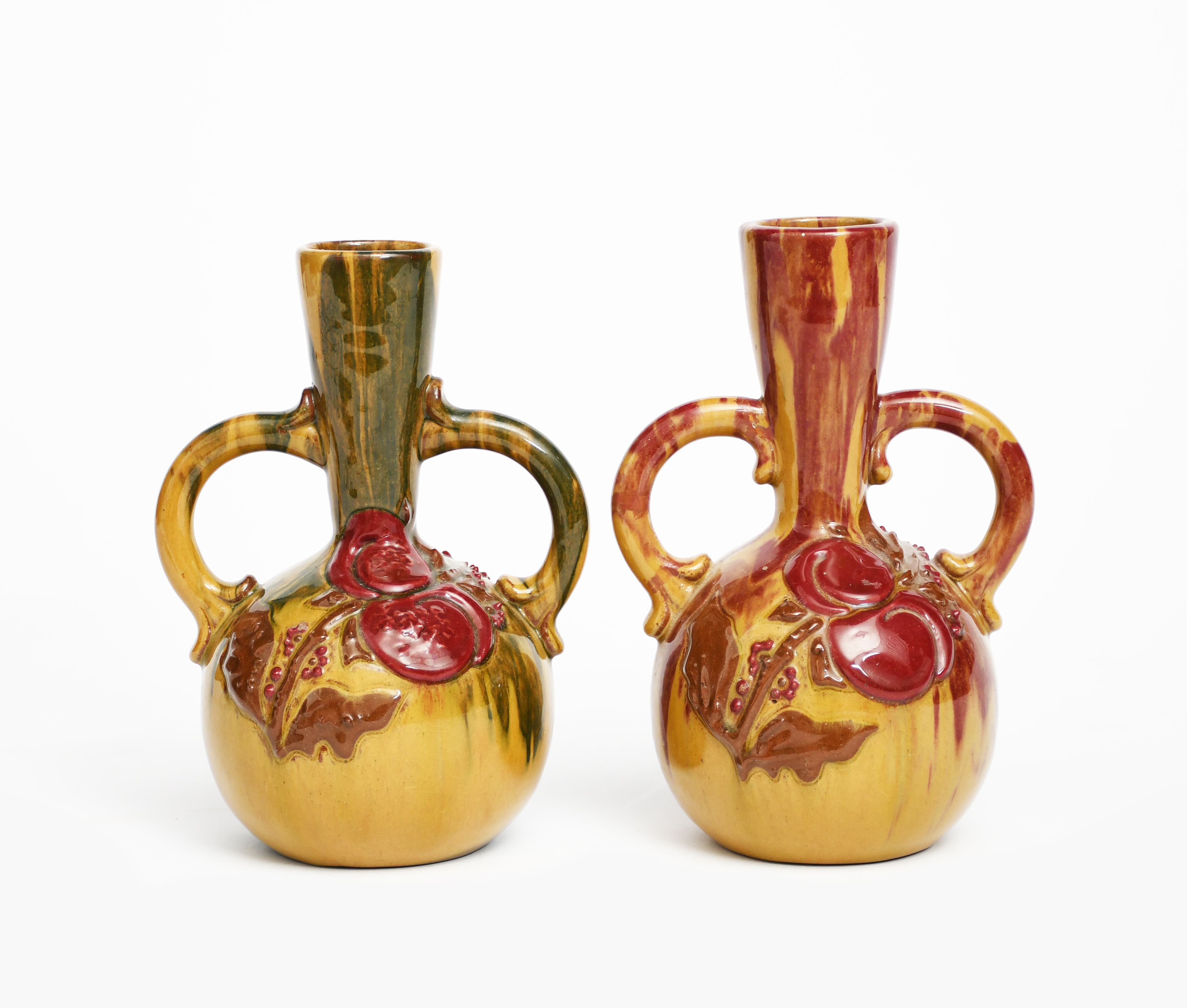 A near pair of Sunflower Pottery vases by Sir Edmund Elton, ovoid with cylindrical neck and twin