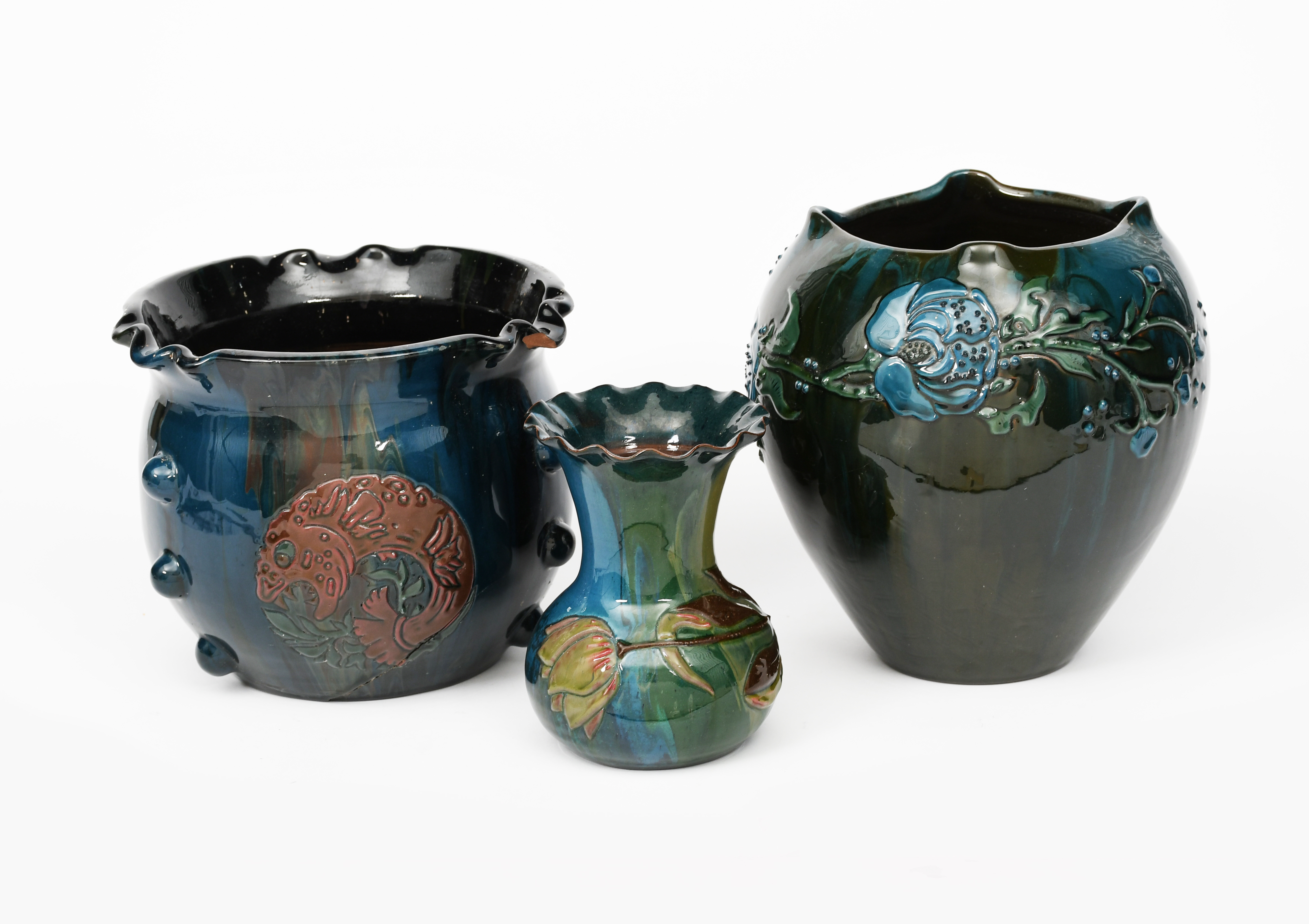 A Sunflower Pottery vase by Sir Edmund Elton, shouldered, ovoid form with flaring neck with pinched rim, applied fish decoration in brown on a streaked green and blue glaze, a Sunflower Pottery vase and a smaller Sunflower Pottery vase, painted Elton mark, chip to top rim, hairline to vase, 14.5cm. high (3)