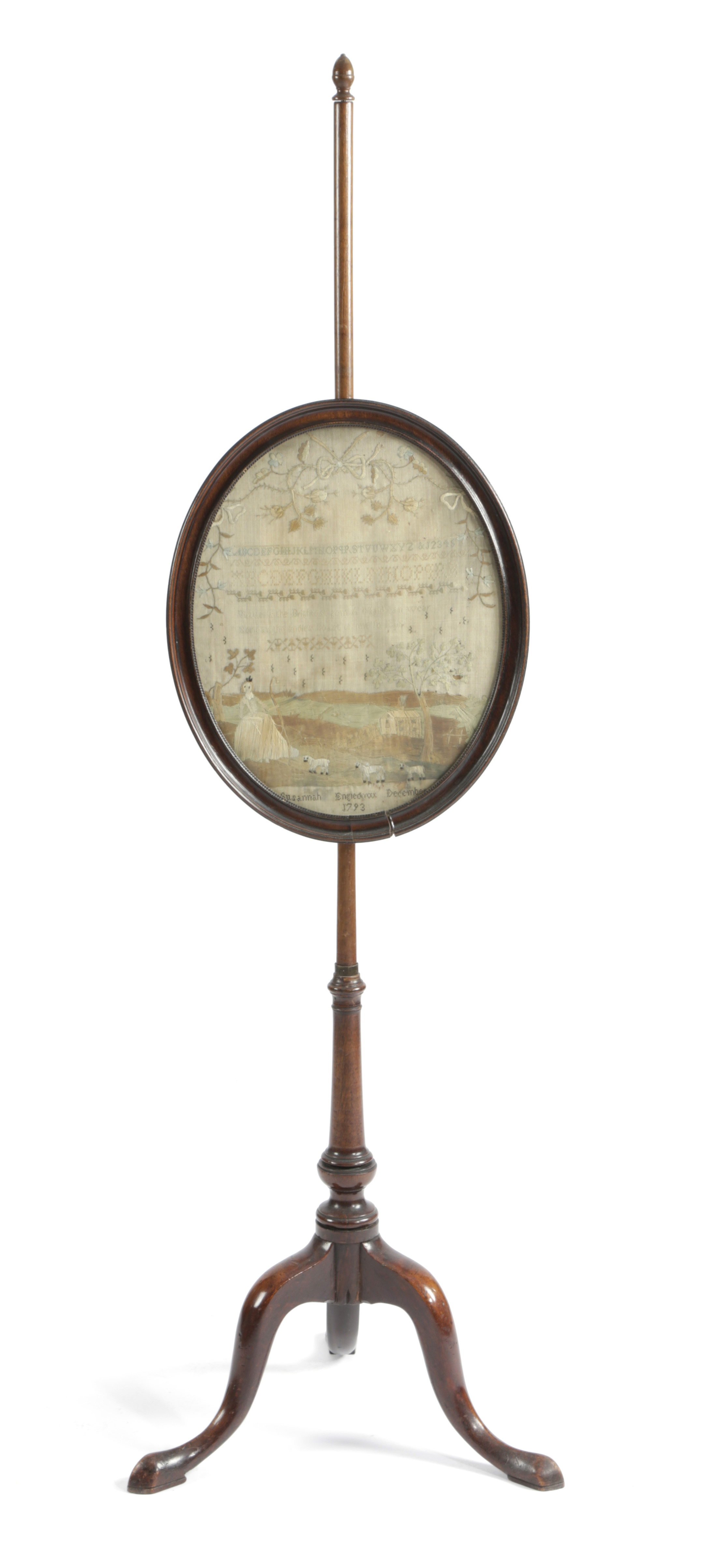 with an adjustable oval panel with a needlework sampler by Susannah Engledow, dated 'December 1793', worked with a shepherdess with her flock in a landscape setting with alphabet, numbers and a short verse