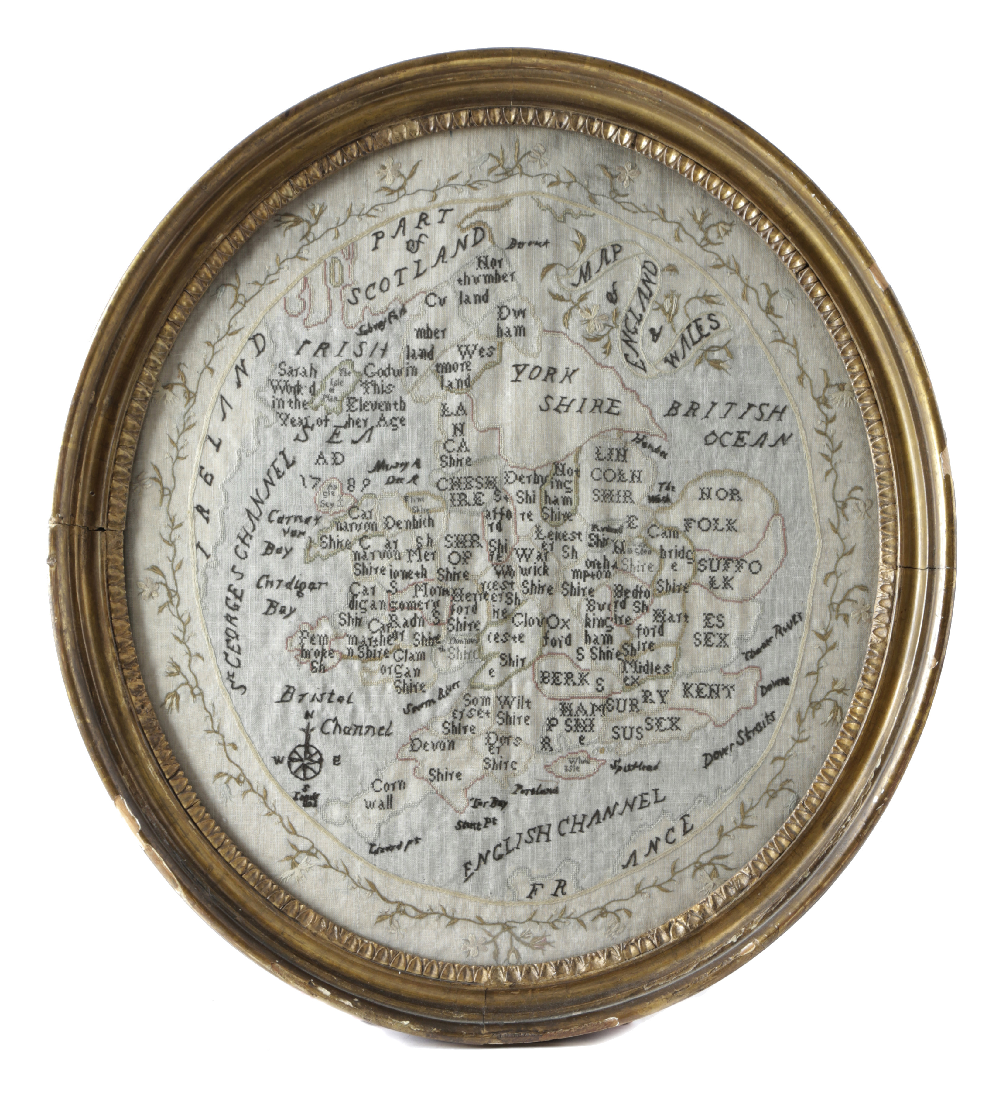titled 'A Map of England and Wales', worked in colours, the counties outlined and named in black, with a compass in black, inscribed 'Sarah Godwin Work'd This in the Eleventh Year of her Age', inside a meandering foliate border, in an oval glazed giltwood frame