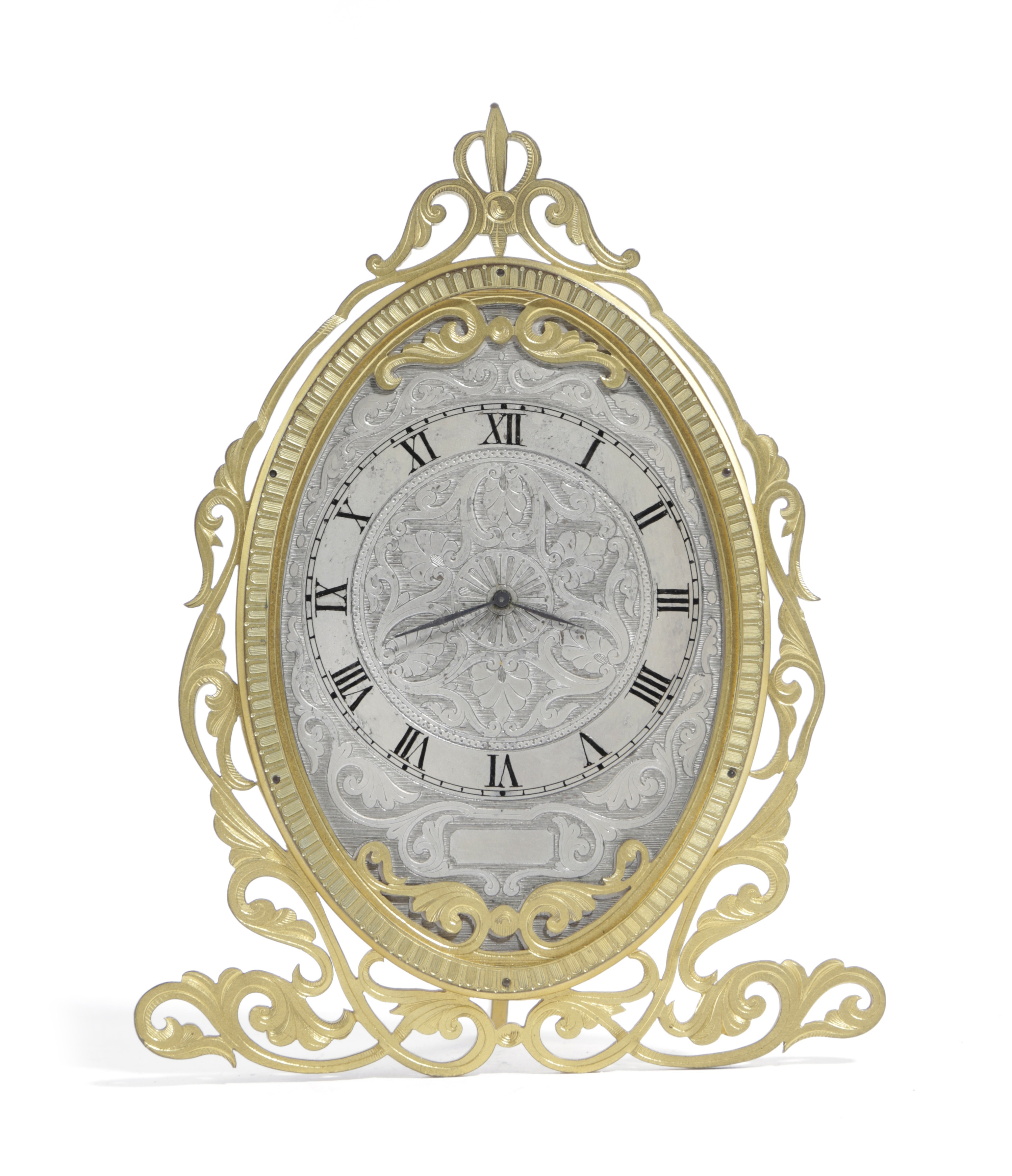 the movement stamped 'GUINAND & CO, GENEVA', with a silvered oval dial with black Roman hours around an engraved scrolling foliate centre, the pierced and engraved frame with an easel back and shuttered winding and adjustment apertures, in a leather bound and silk lined case (2)