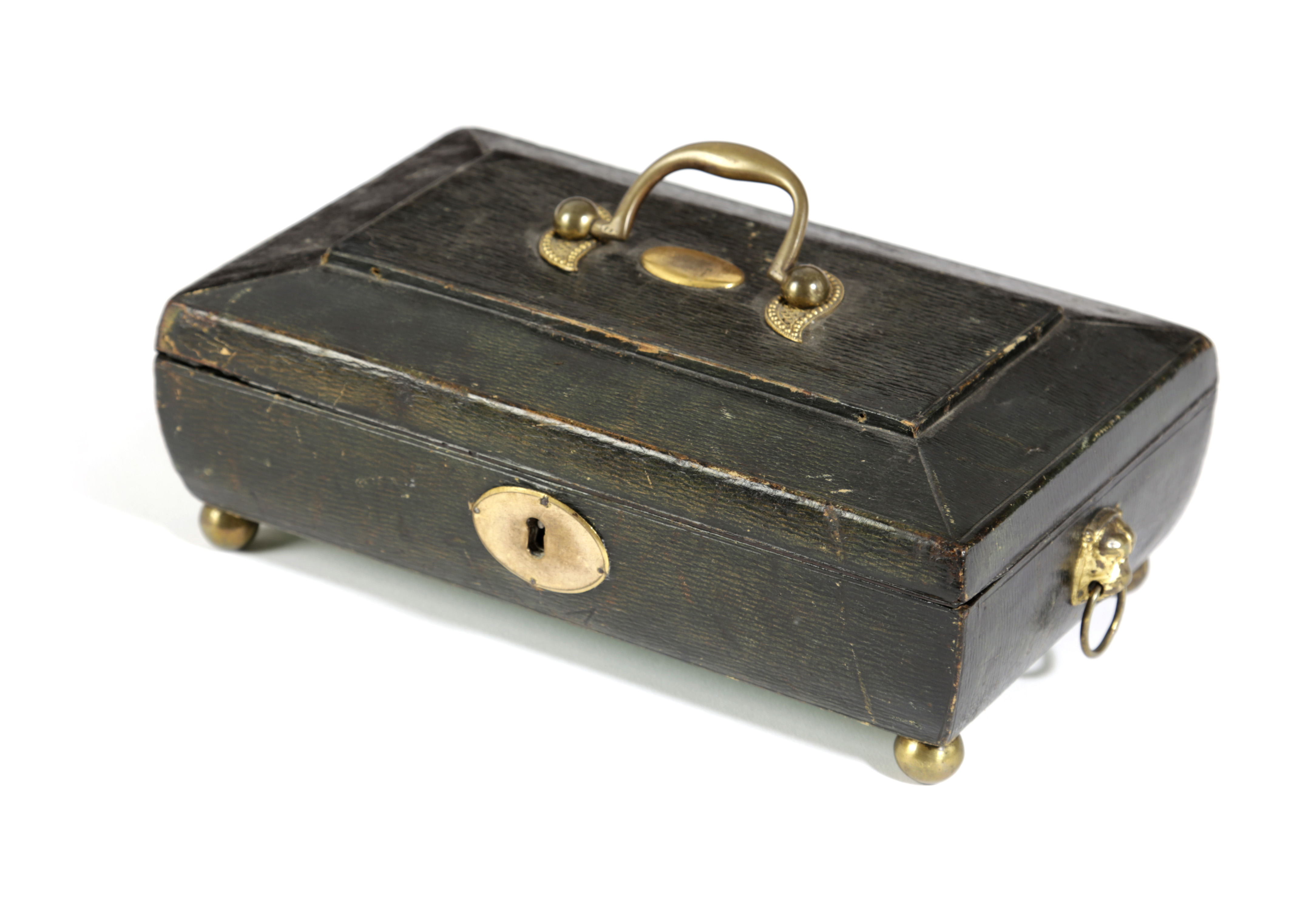 of sarcophagus shape, with brass handles and mounts, the compartmented interior fitted with various utensils, including: two silver thimbles, a miniature pair of scissors and a pen knife, a tape measure and other items