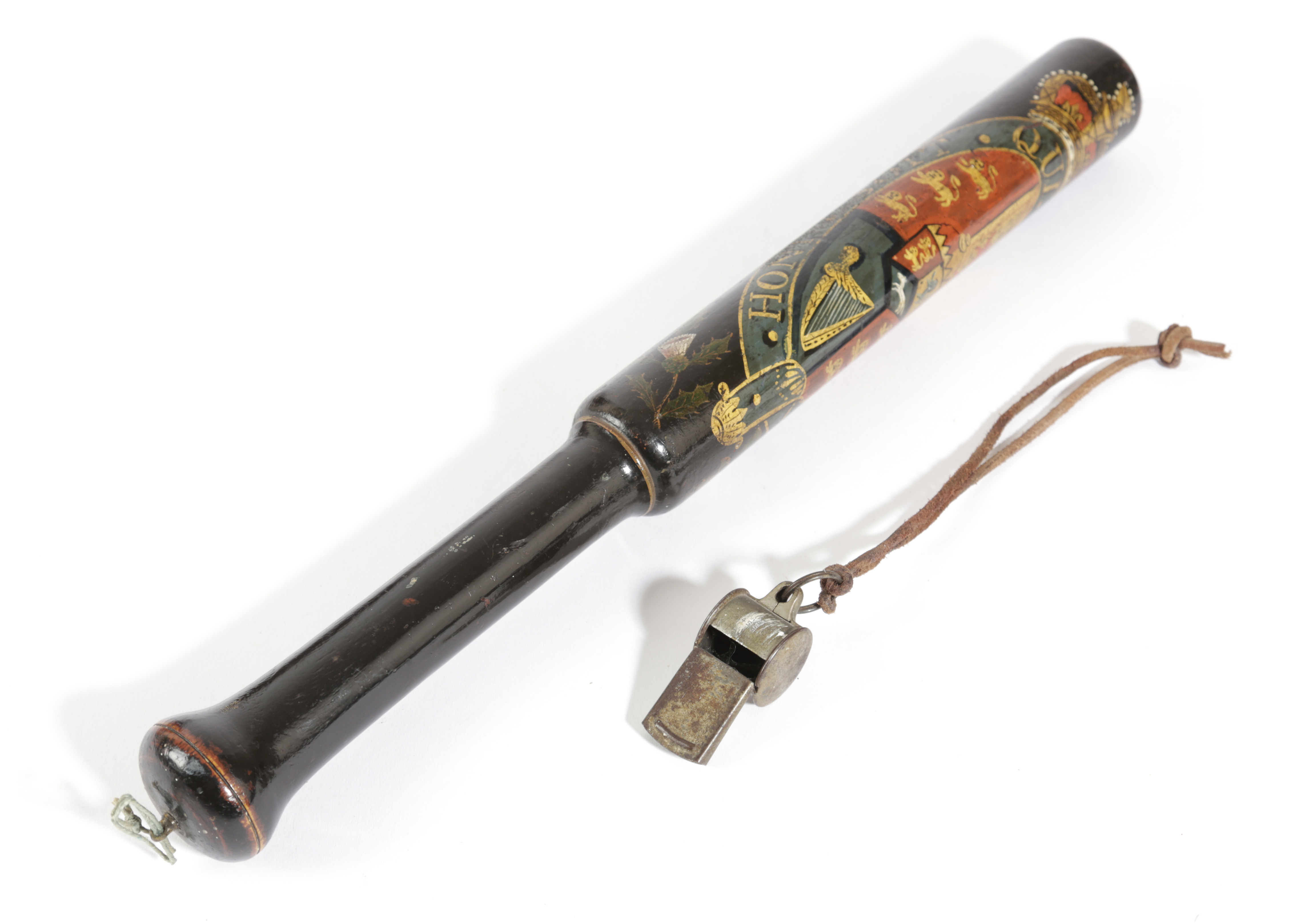 polychrome decorated on an ebonised ground with the Royal Coat of Arms with the Scottish Thistle and the English Rose with intitals 'GR IIII' and with a crescent moon and star motif, together with a policeman's whistle (2)
