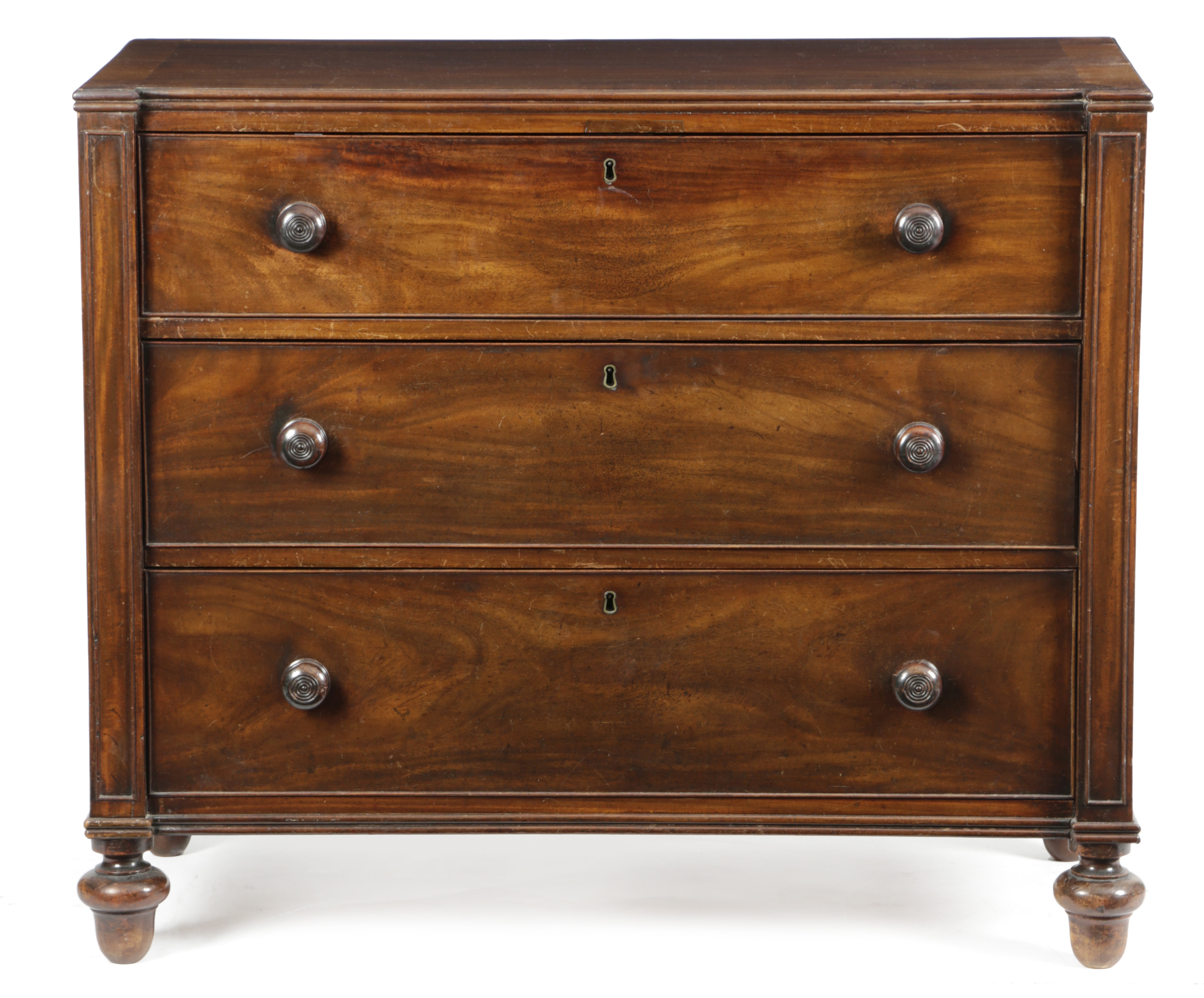 the crossbanded breakfront top above three long drawers flanked by tablet pilasters, on mushroom feet