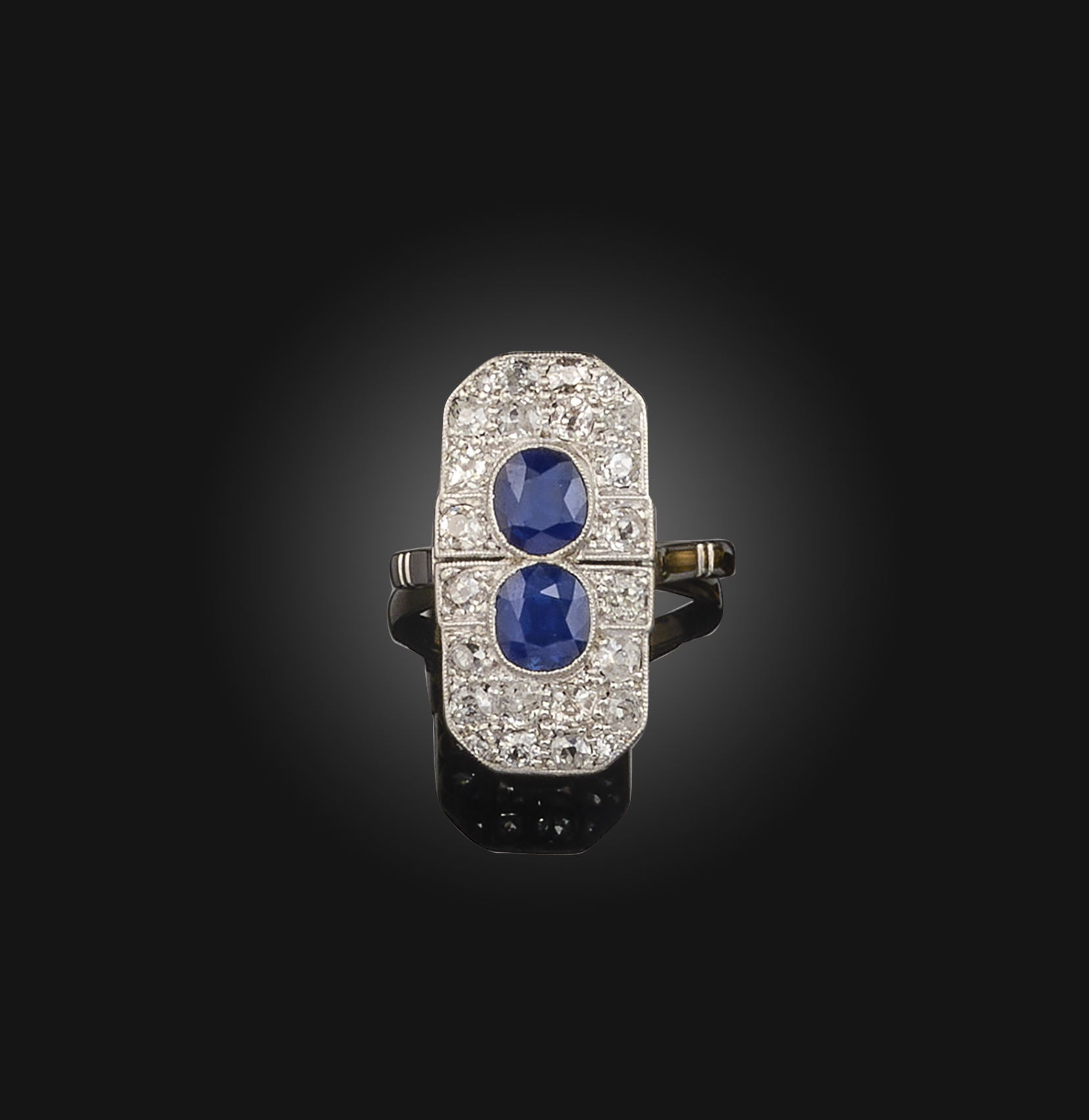 An early 20th century sapphire and diamond ring, set with two oval sapphires within a surround of