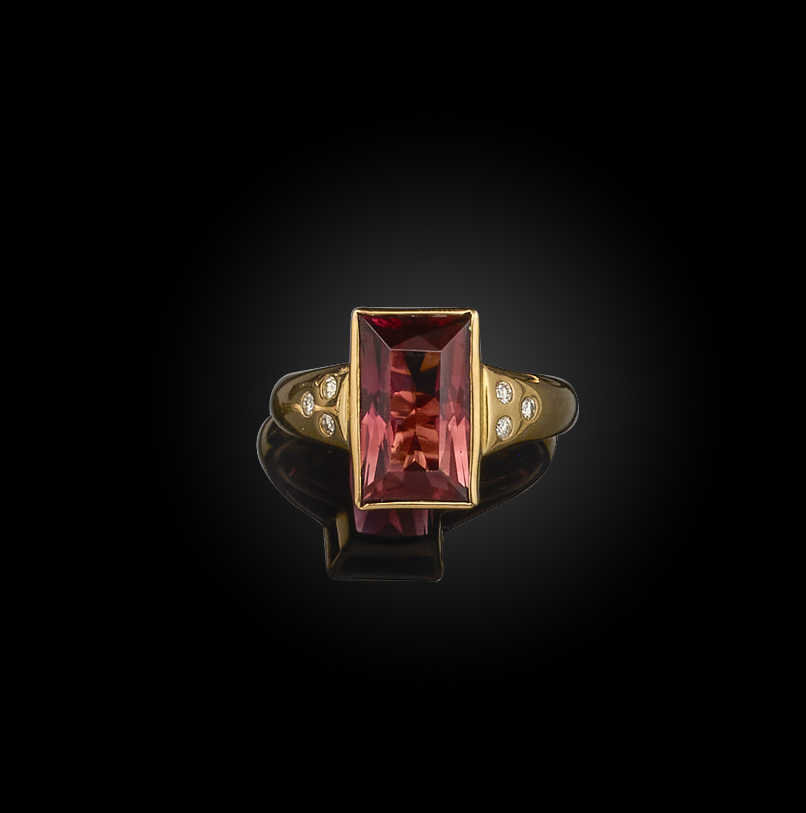 A tourmaline and diamond ring, the pink French-cut tourmaline with diamond-set shoulders to 18ct yellow gold mount, Birmingham hallmarks for 2001, size T,