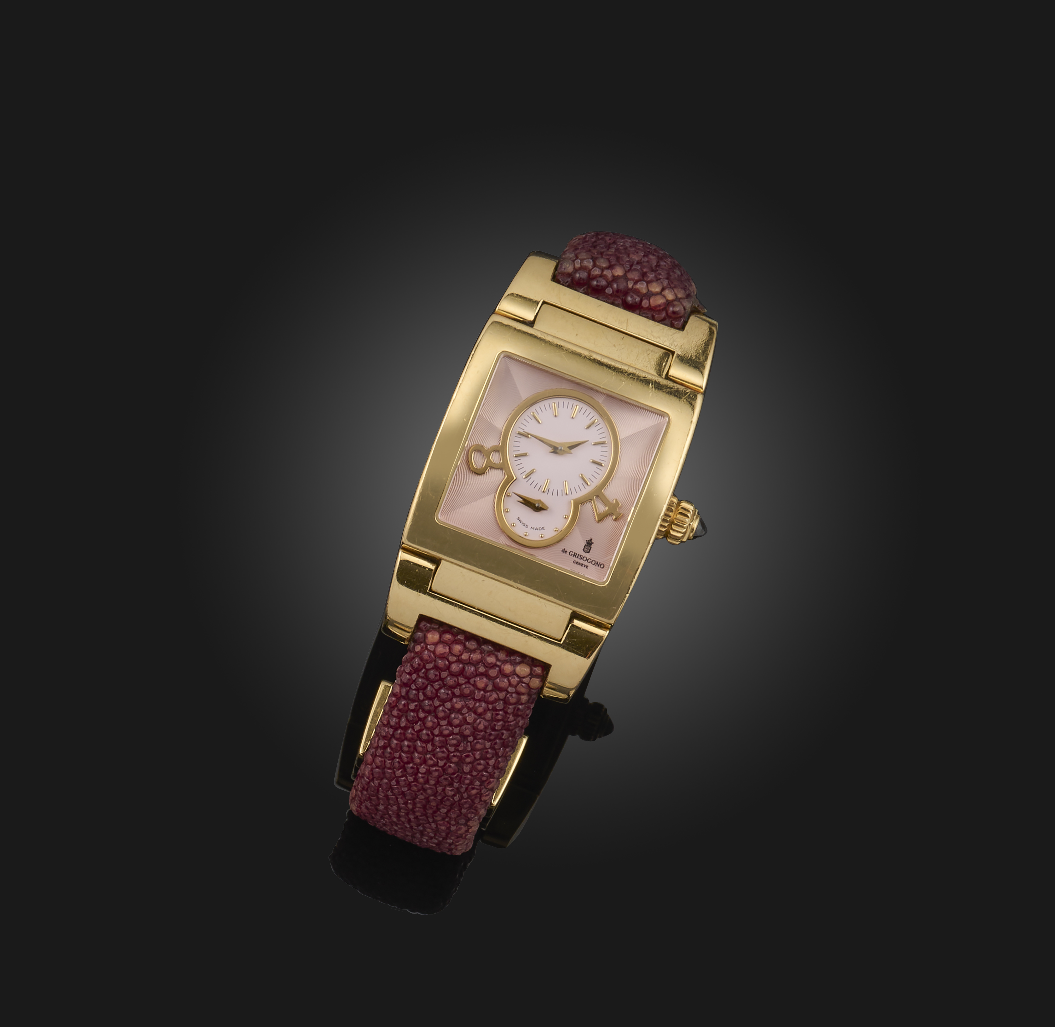 De Grisogono a lady's gold 'Instrumentino' dual time wristwatch, ref. 6760, the rectangular pink