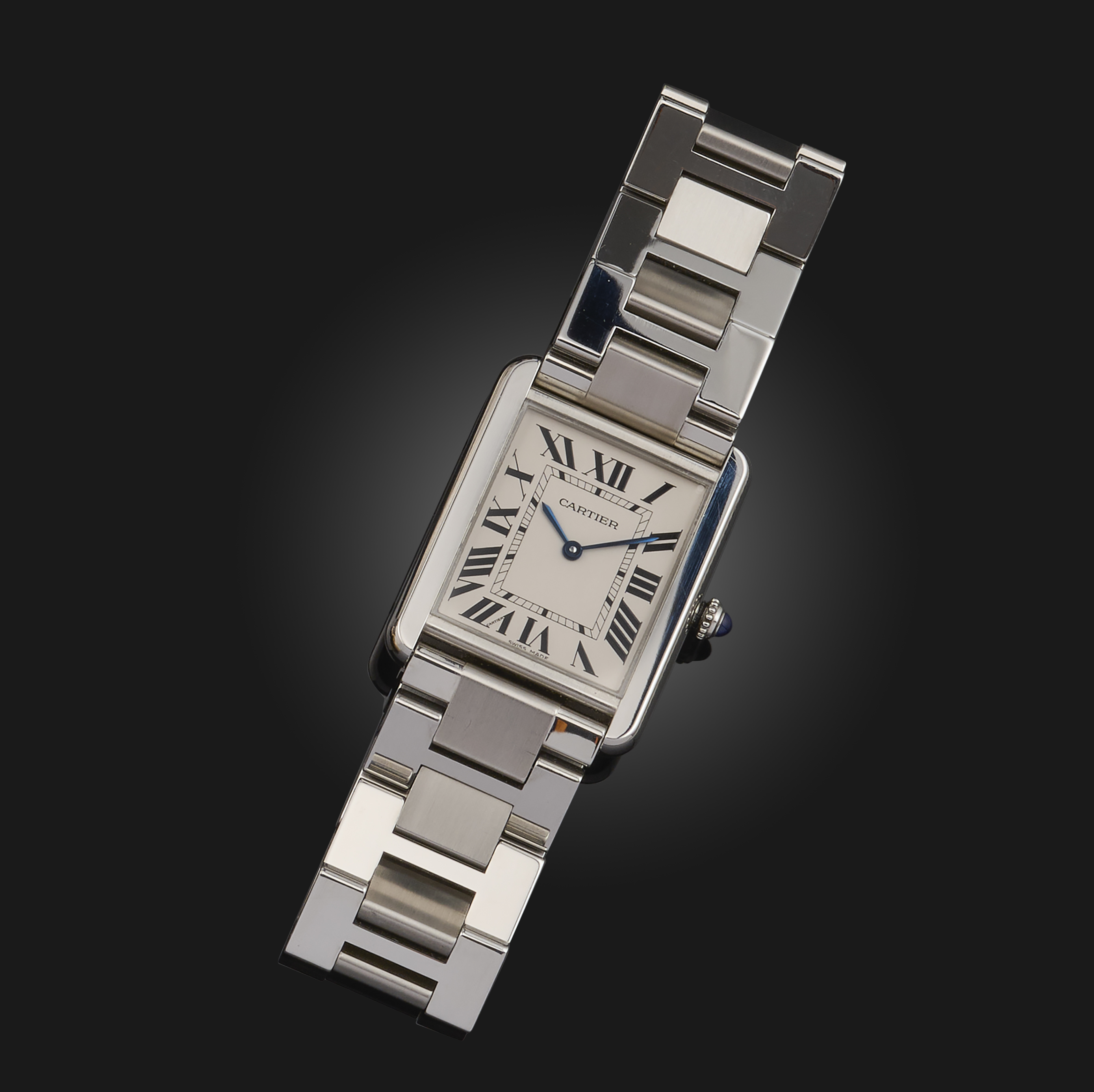 Cartier, a gentleman's stainless steel watch, 'Tank Solo', ref. 3169, rectangular signed white dial, Roman numeral indicators, secret signature at VII, synthetic sapphire winder, stainless steel case and integrated link bracelet with double deployant clasp, case width 2.6cm, signed Cartier, quartz movement, ref. 3169, case no. 771697UX