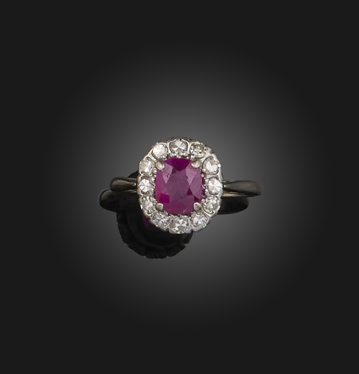 A ruby and diamond cluster ring, the cushion-shaped ruby set within a surround of single-cut
