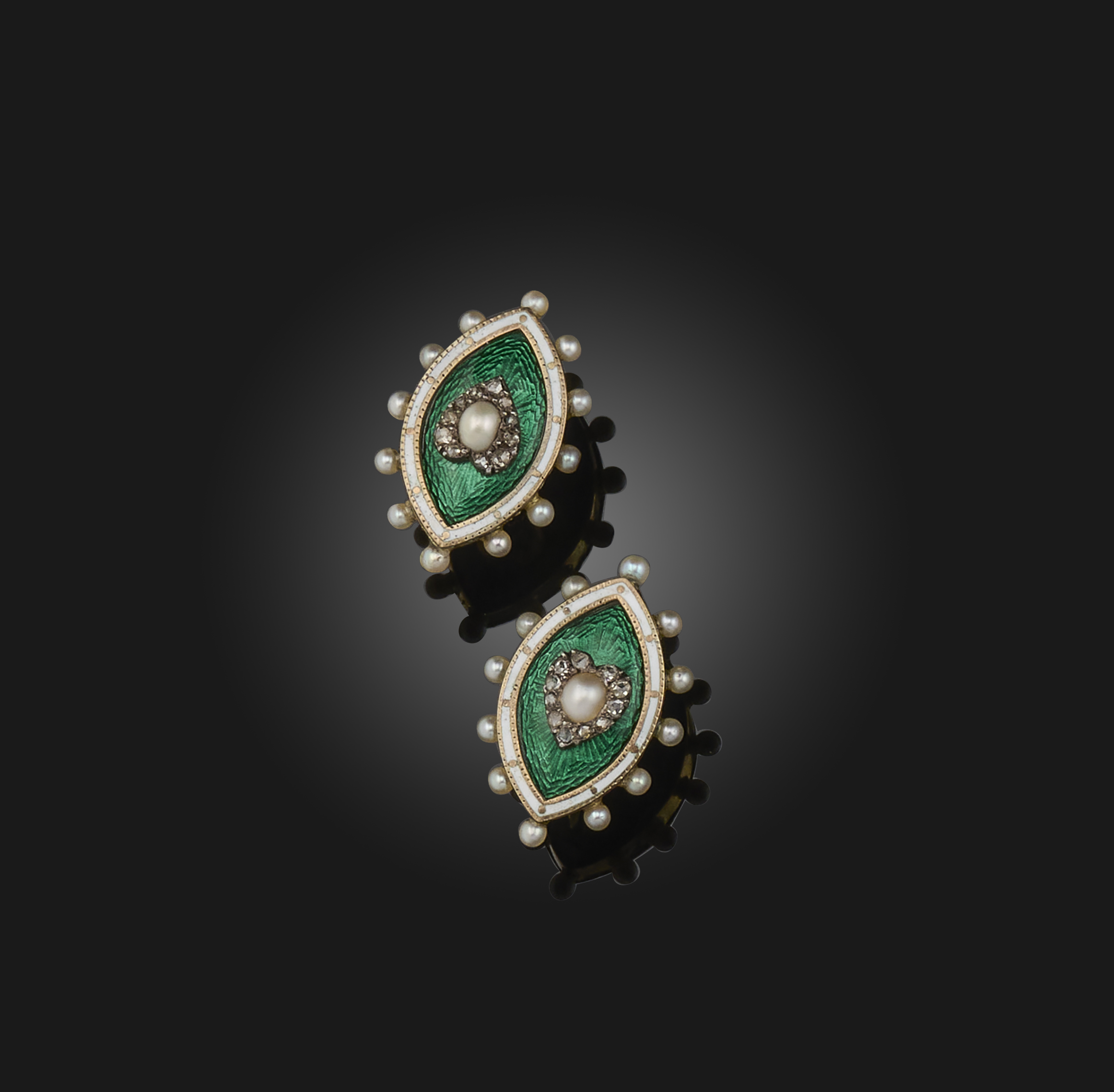 A pair of enamel, pearl and diamond earrings, early 20th century and later, each of navette-shaped outline, each applied with green guilloché and white enamel, centred on a half pearl within a heart-shaped border of rose-cut diamonds, to an outer border of seed pearls, mounted in gold, length 2.5cm each, later screw fittings