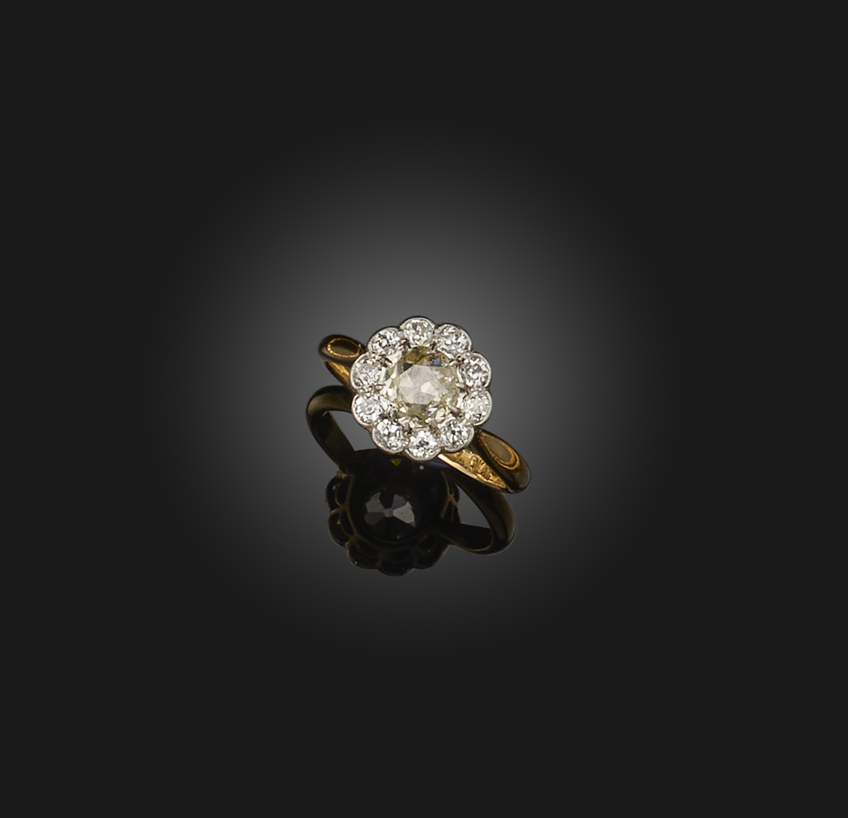 A diamond ring, early 20th century, of cluster design, set with a circular-cut diamond weighing