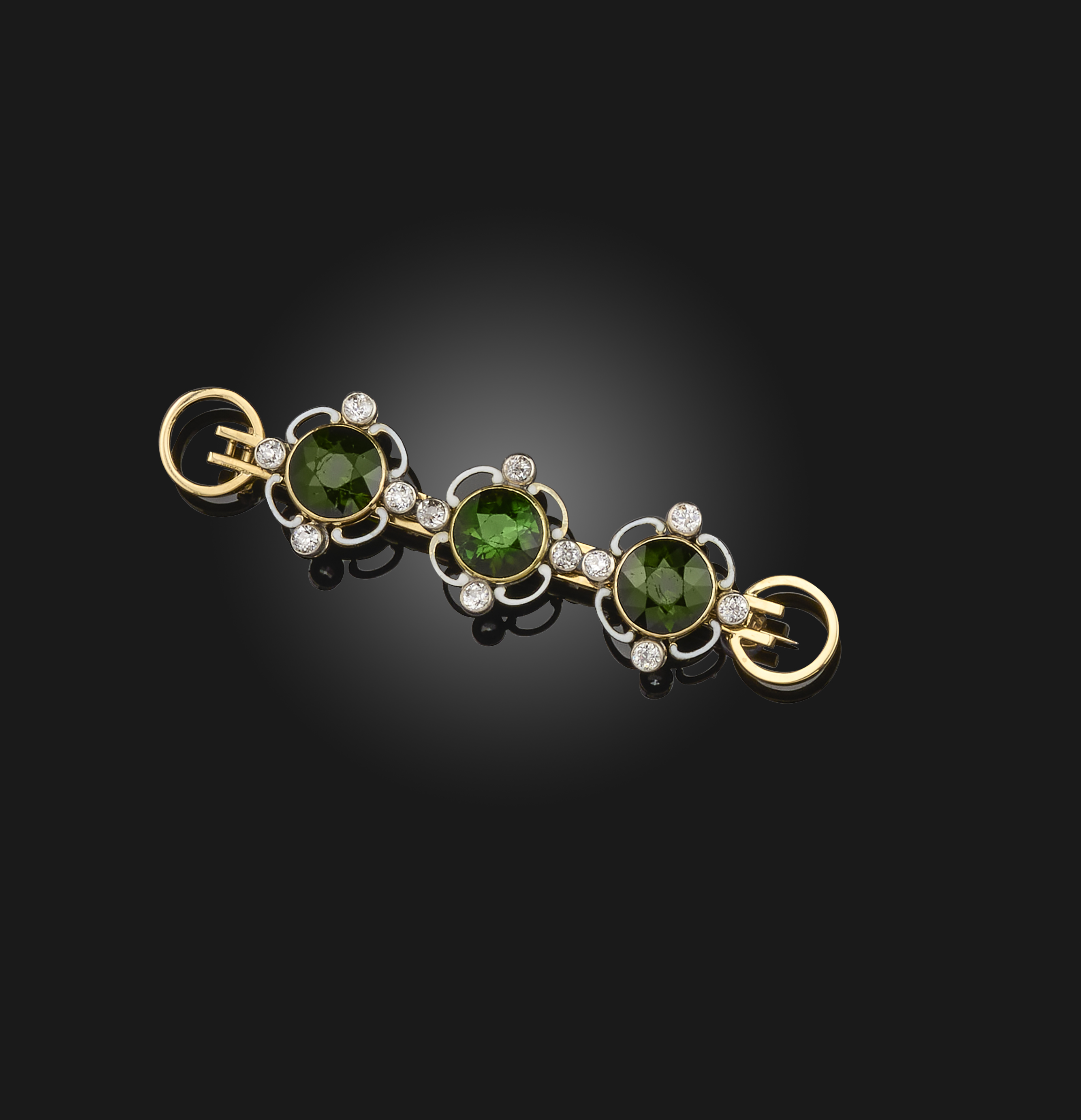 A tourmaline, enamel and diamond bar brooch, designed as a line of three circular-cut green
