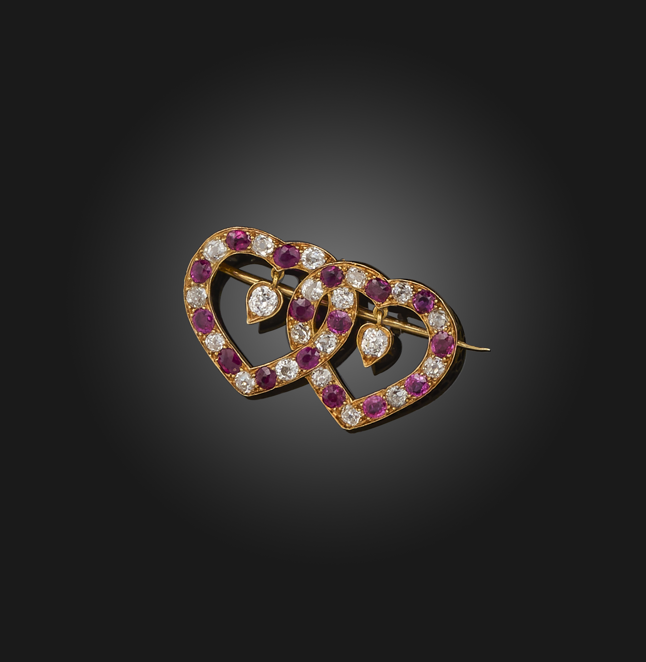 A Victorian ruby and diamond brooch, late 19th century, designed as two interlocking hearts, each enclosing a pendant, set with circular-cut and cushion-shaped rubies and diamonds, mounted in gold, length 3.5cm