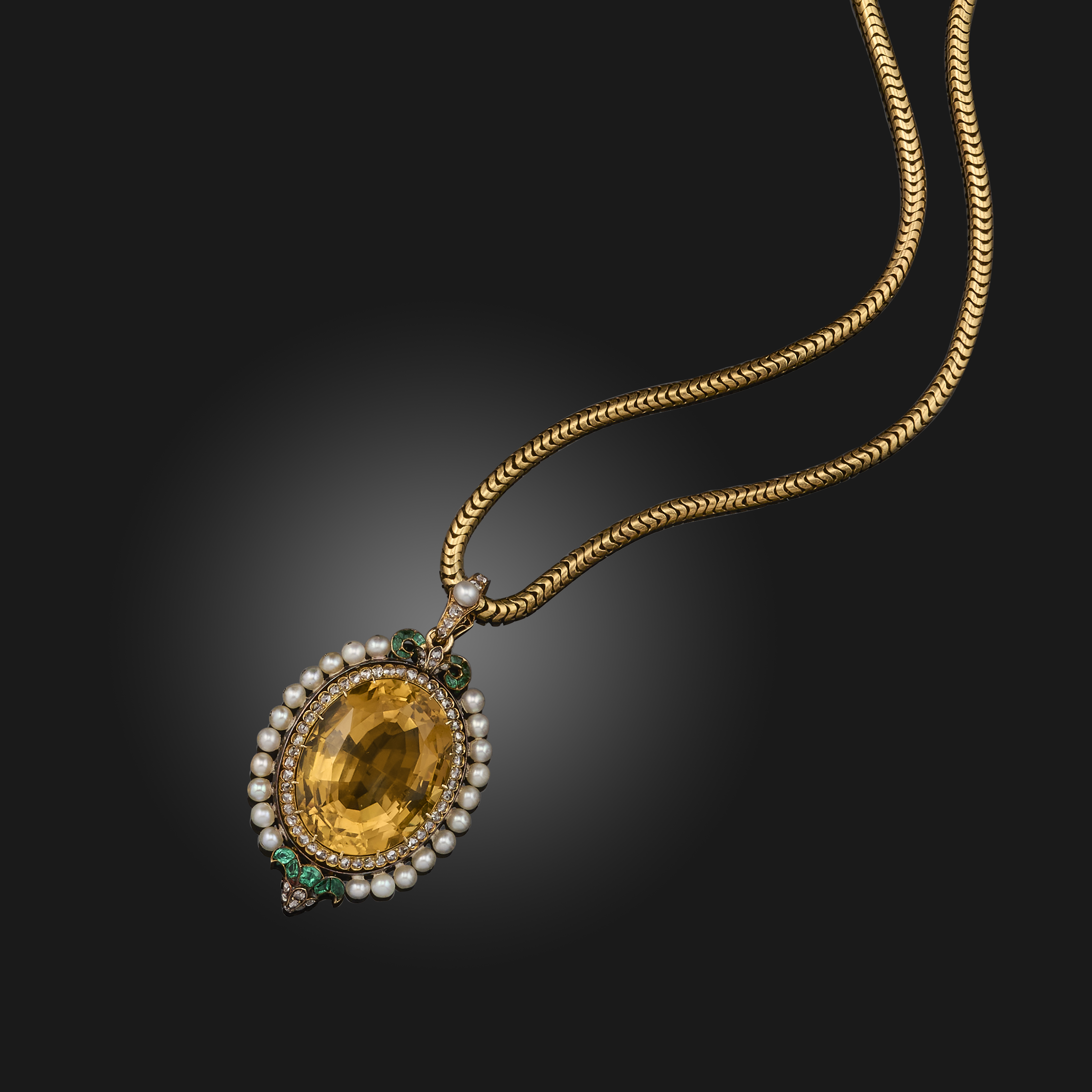 A citrine, emerald, pearl and diamond pendant, France, late 19th century, designed as an oval