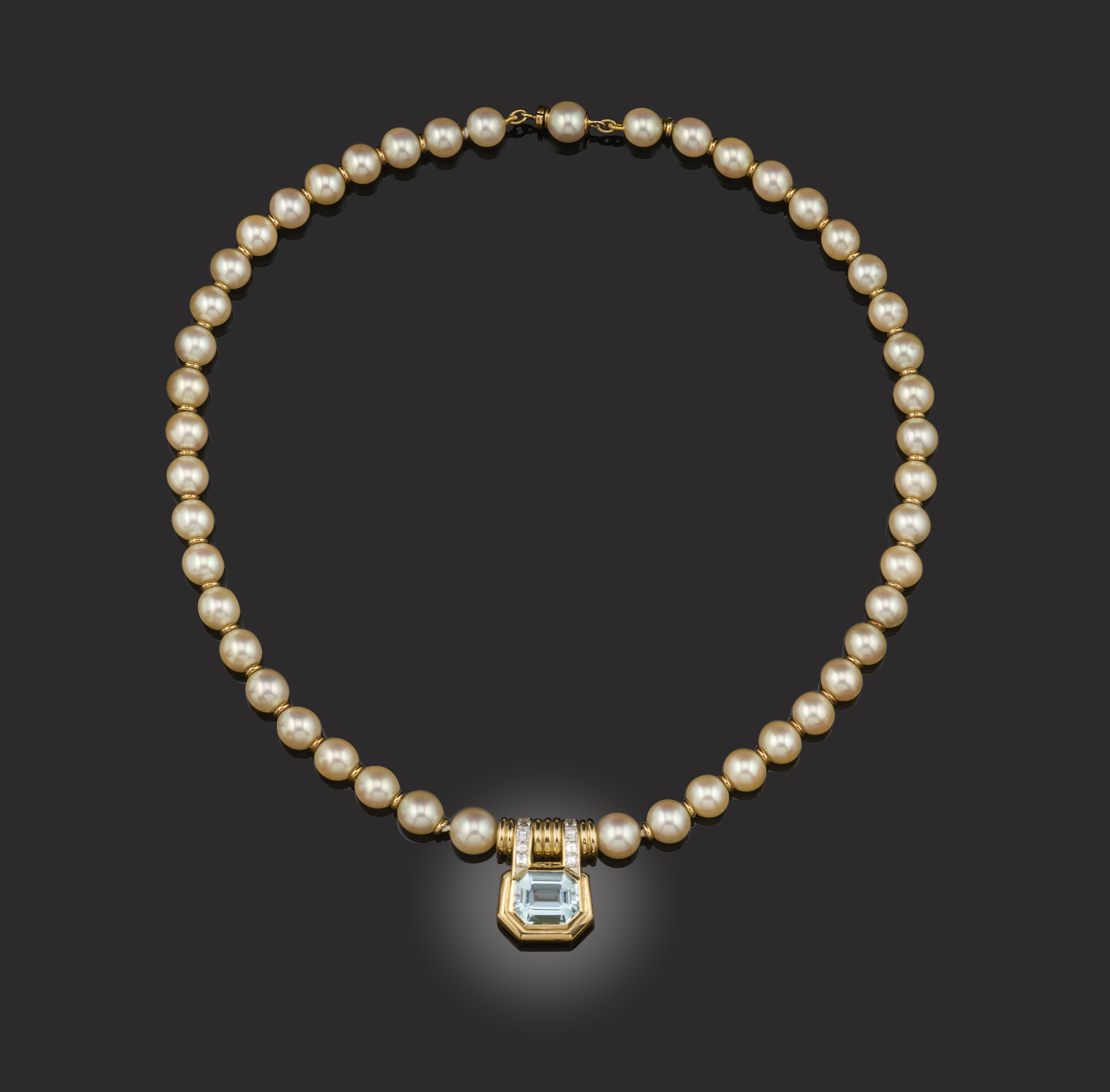 Bulgari, a cultured pearl, aquamarine and diamond necklace, designed as a single row of cultured