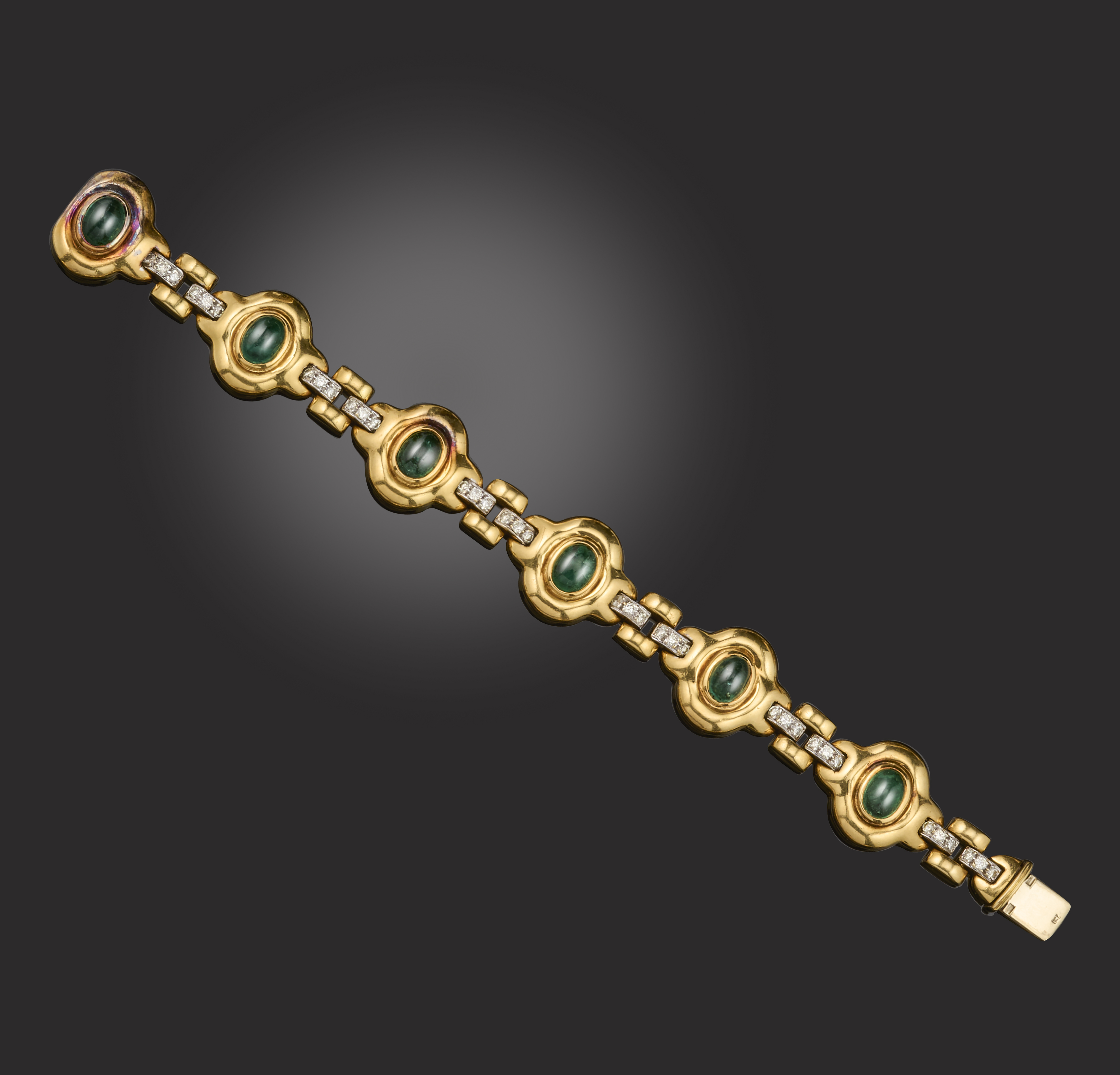 An emerald and diamond bracelet, composed of links collet-set with cabochon emeralds, connected by lines of brilliant-cut diamonds, mounted in 18ct gold, length 16.6cm, British hallmark, date letter for 1996, gross weight 55 grams