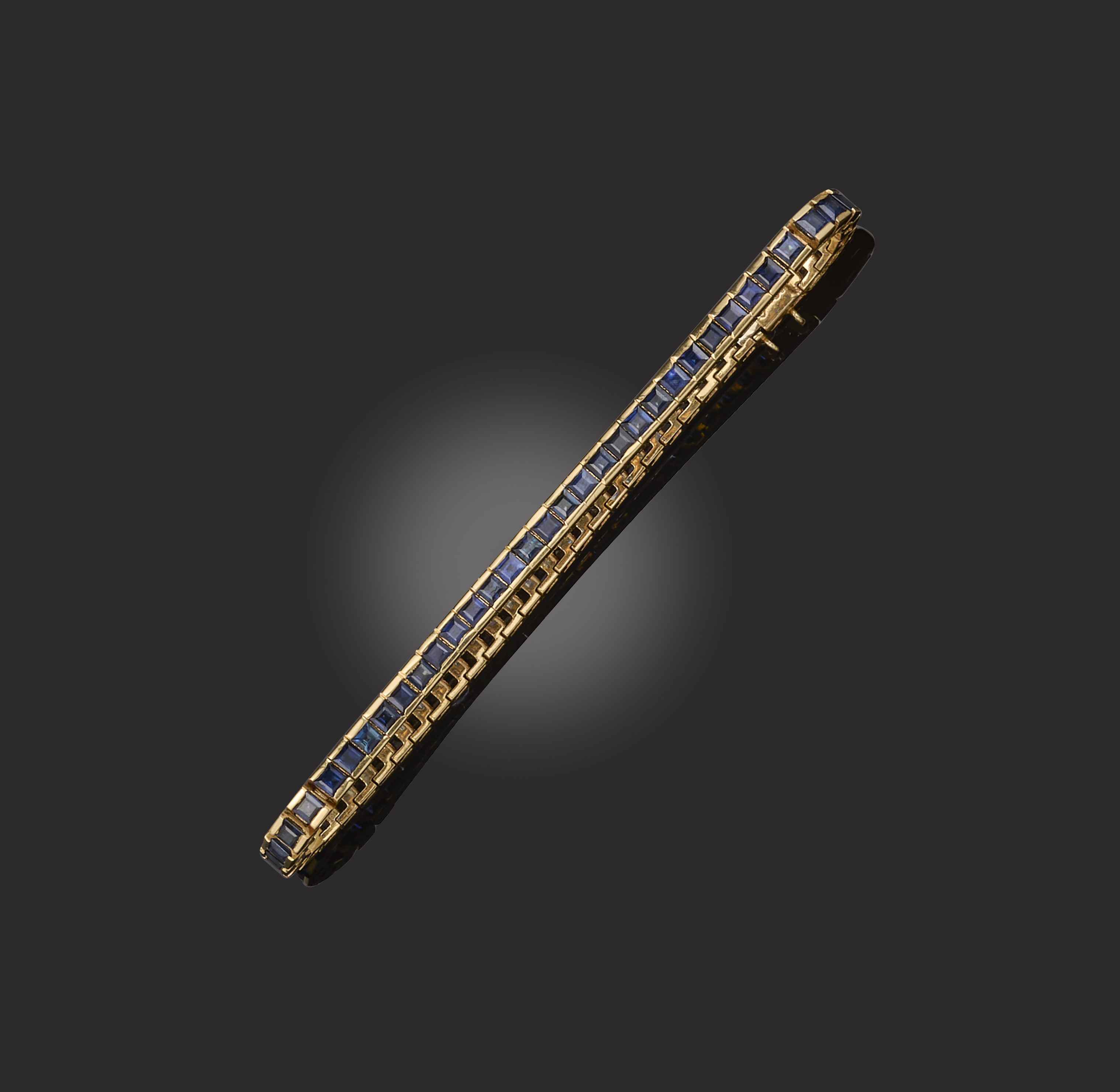 A sapphire line bracelet, set with calibre-cut sapphires in yellow gold setting, stamped 18k, length 18.6cm