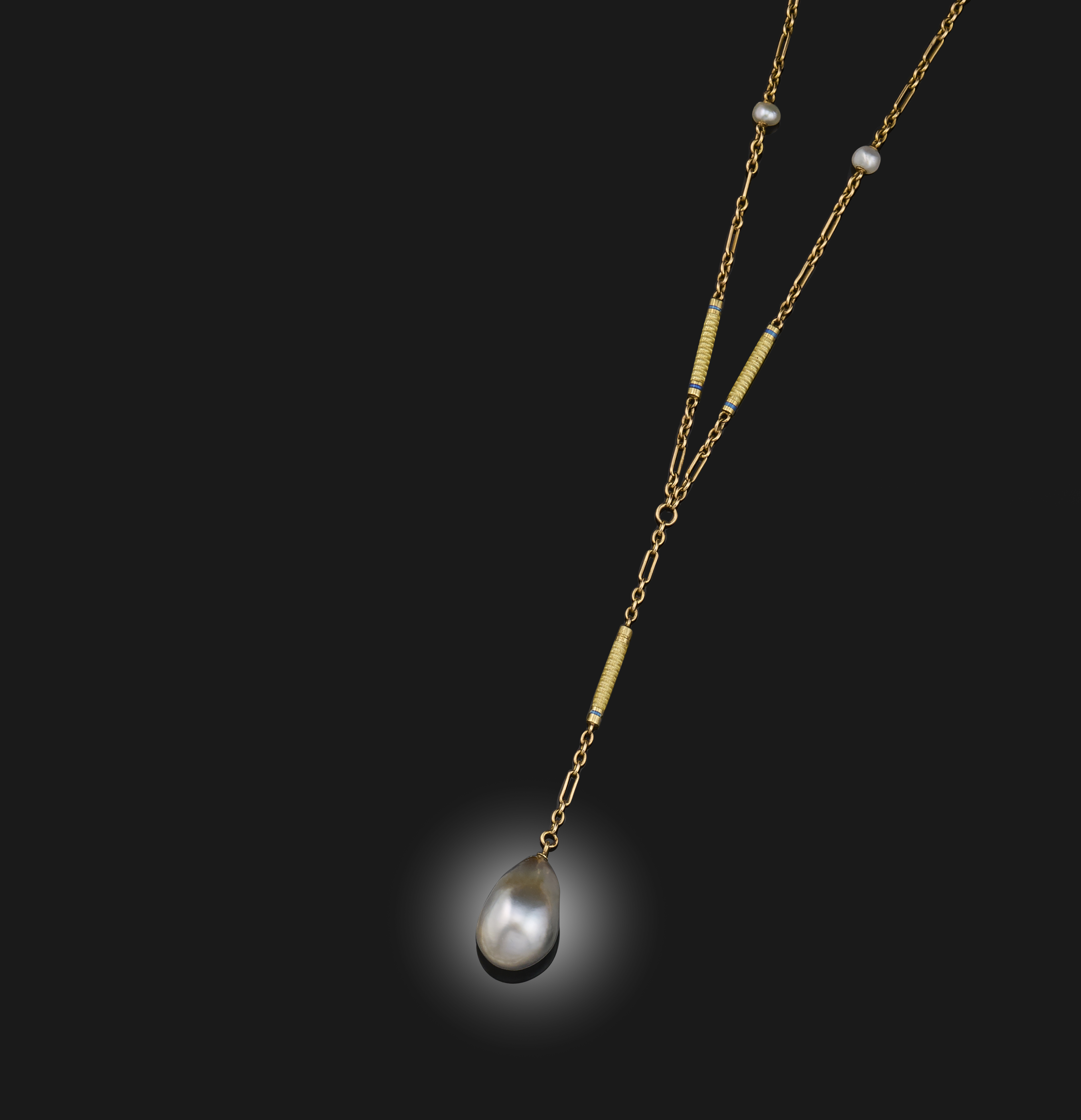 An early 20th century pearl necklace, the natural saltwater pearl suspending from a yellow enamel