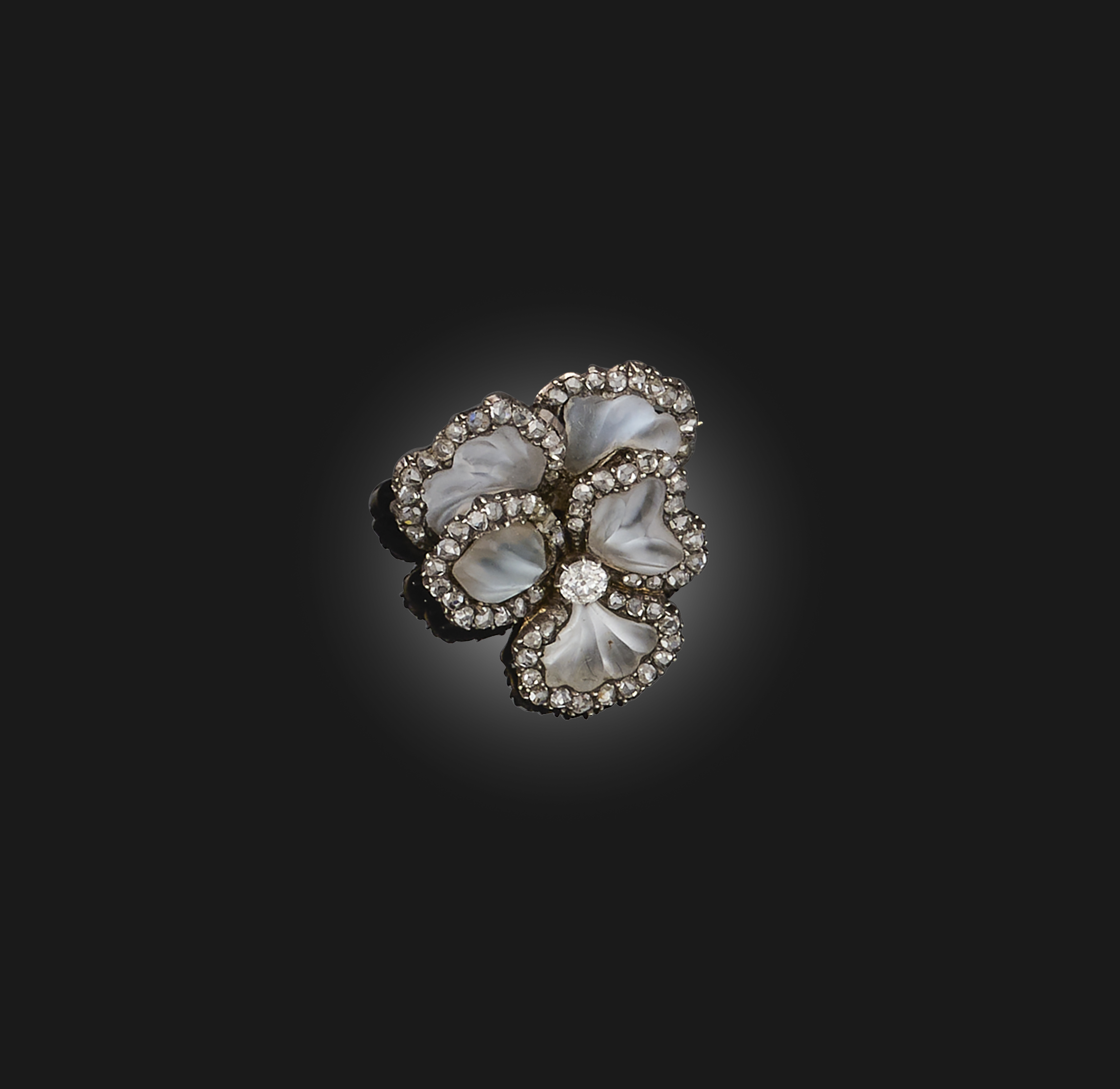 A late 19th century pansy brooch, set with carved moonstone and diamond accents in silver and gold,