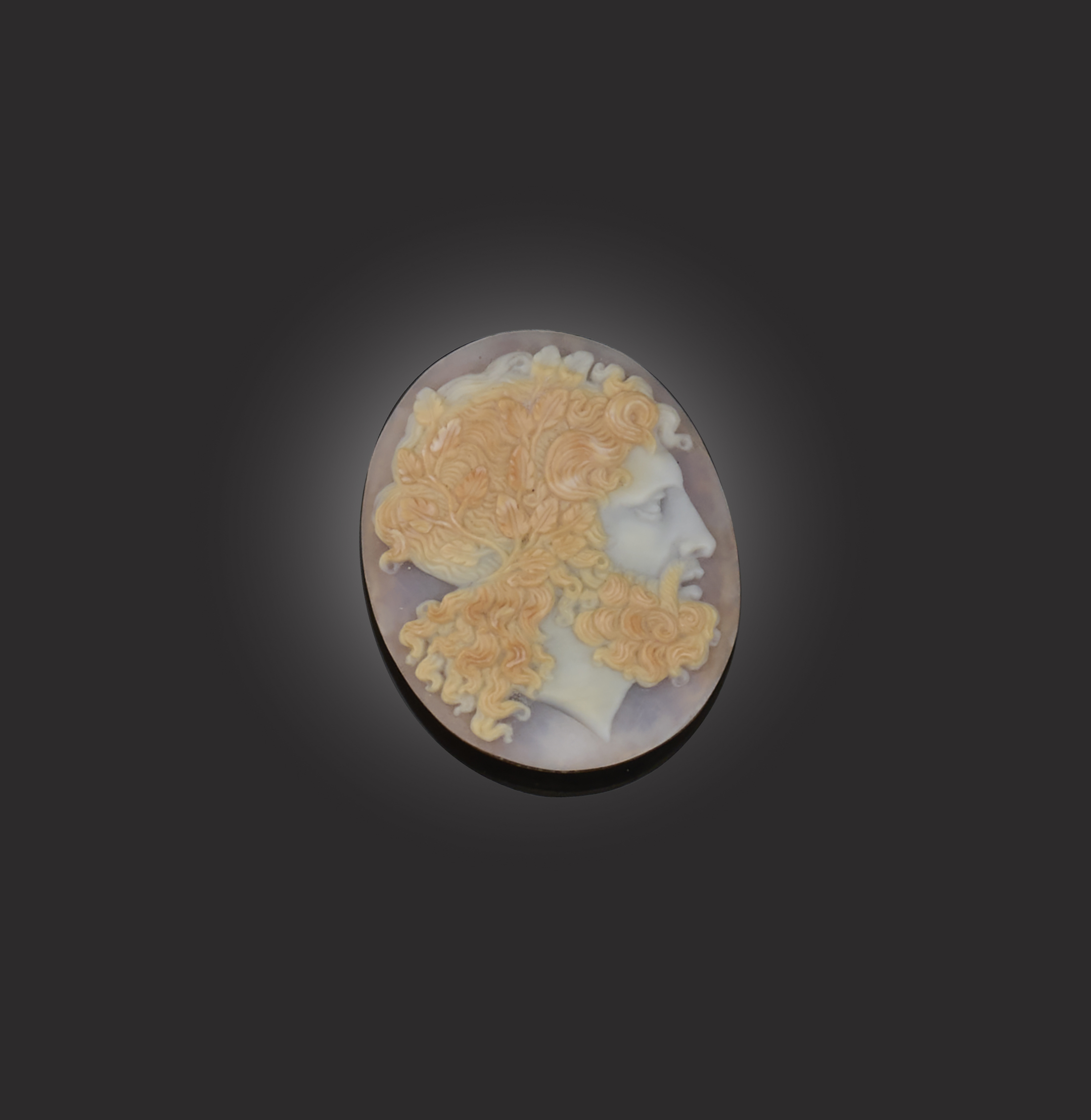 A shell cameo, probably depicting the profile of Dionysus, with flowing vines to his hair, backed,