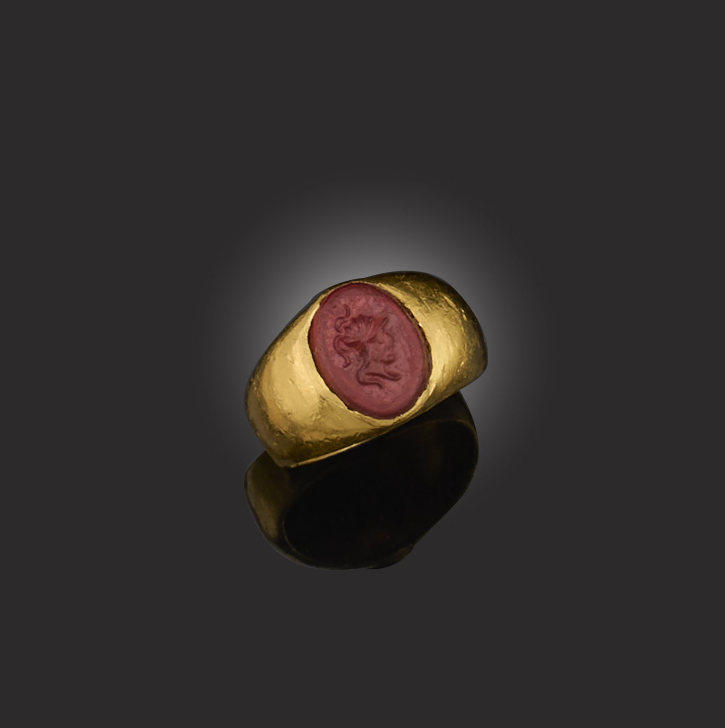 A jasper intaglio ring, engraved with the head of Ares in profile, in plain yellow gold setting,