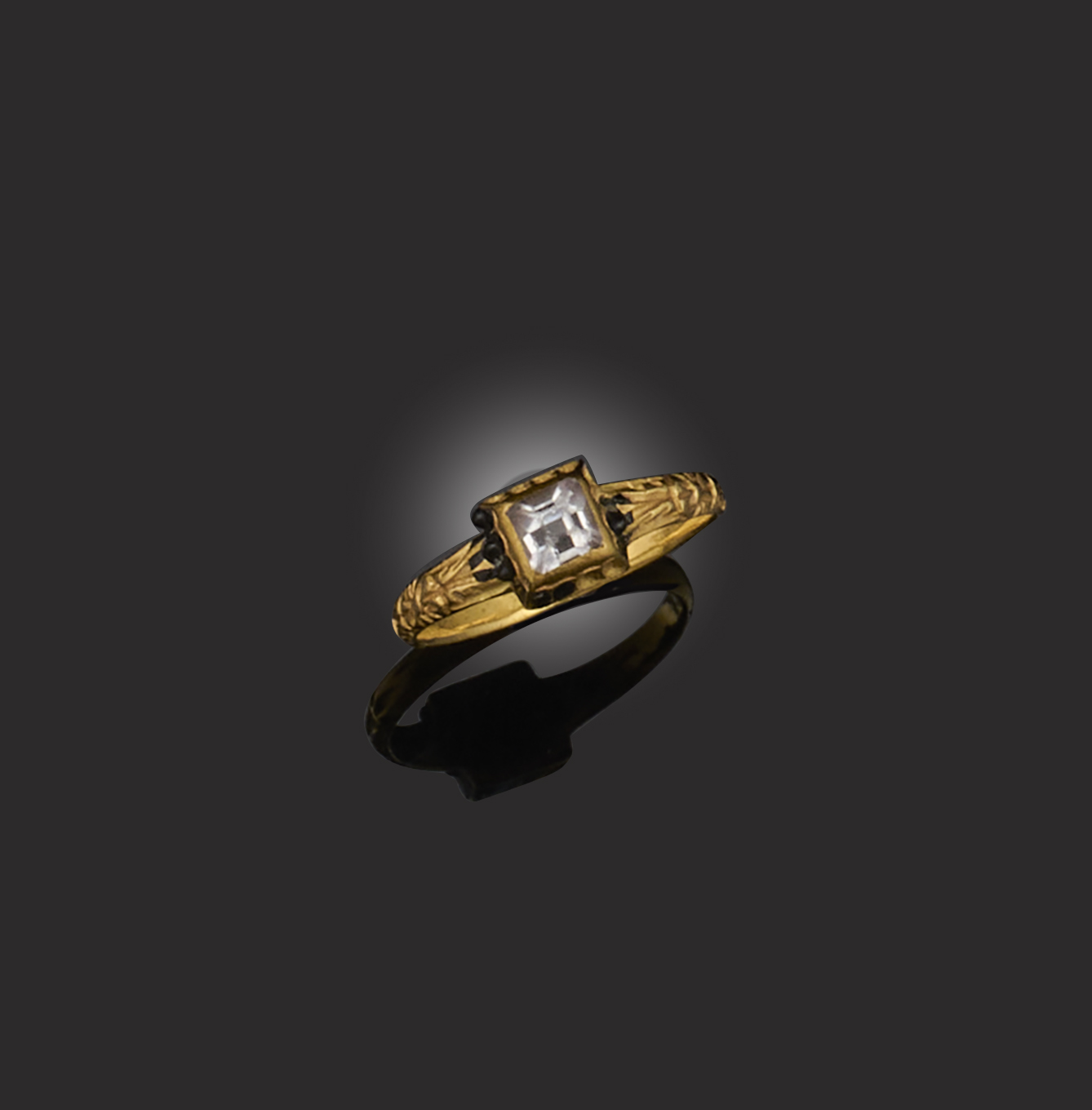 A rock crystal, gold and enamel ring, late 17th century, set with a table-cut rock crystal within a square collet setting accented with stripes of black enamel, to shoulders carved with floral designs, constructed in gold, size H1/2