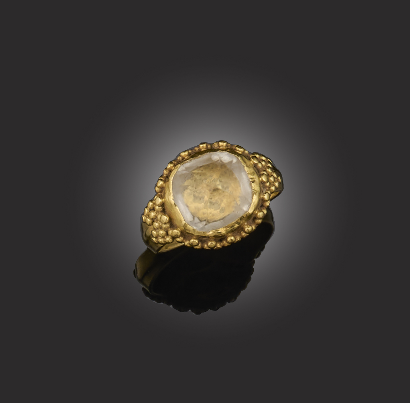 An early 19th century gold ring mounted with a faceted rock crystal, with point uppermost, and applied with pellets to the bezel and shank, in the style of an ancient design, gold tests as 18ct, size I, the gold tests as 18ct