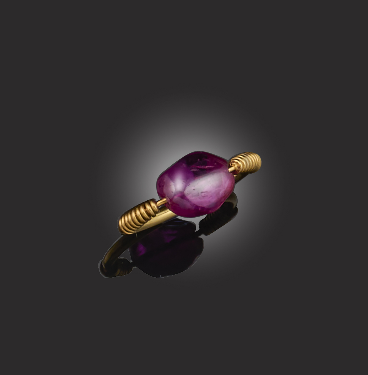 A ruby ring, the gold wire band with coiled shoulders, threaded with a ruby bead, size K