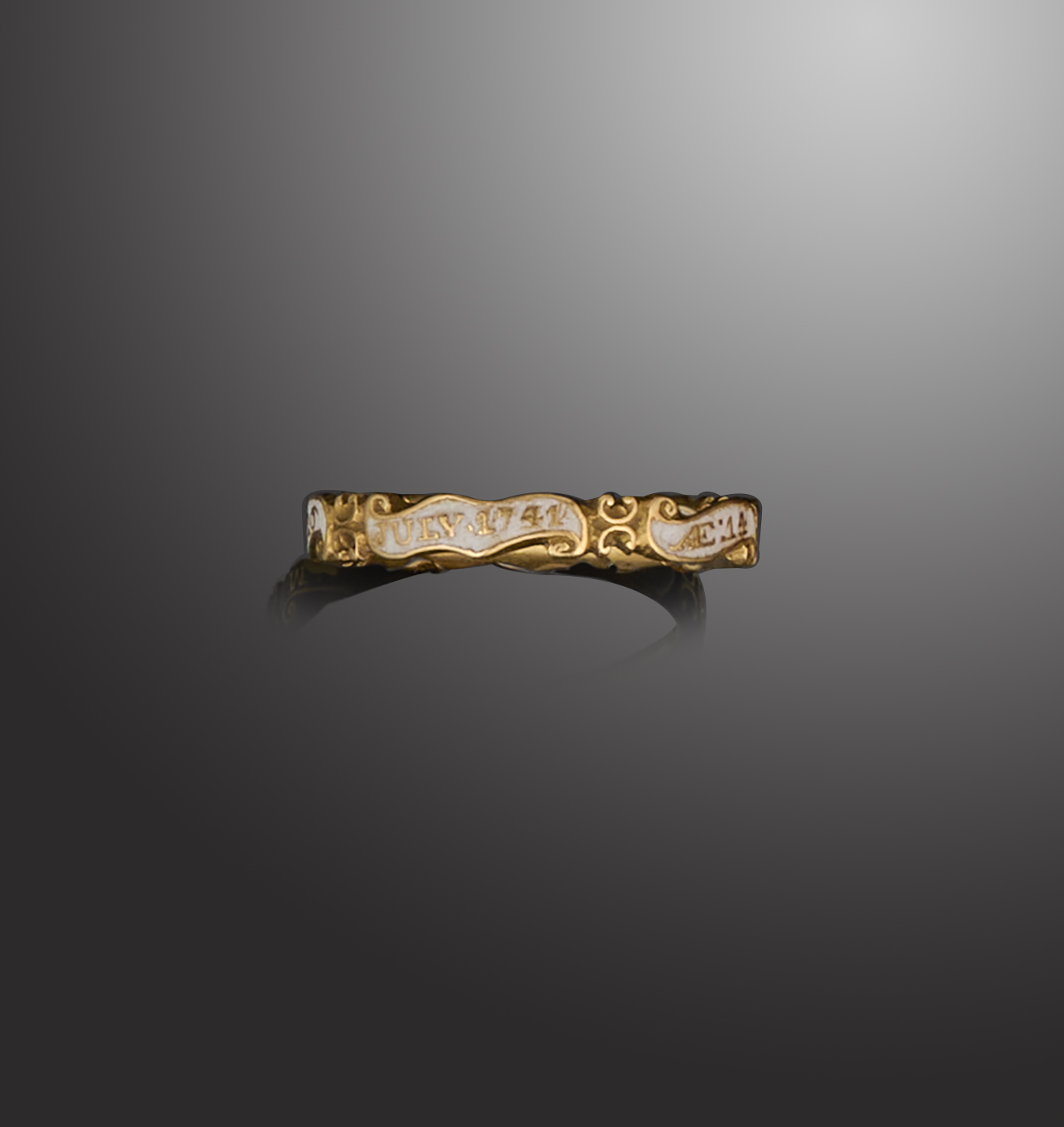 A rare George II mourning ring, circa 1741, composed of scrolled banner motifs applied with white enamel, the commemorative inscription 'MARY FISHER OB: 26 JULY. 1741 AE:14' in reserve, mounted in gold, size Q1/2, maker's mark JP